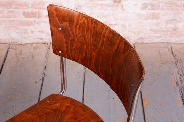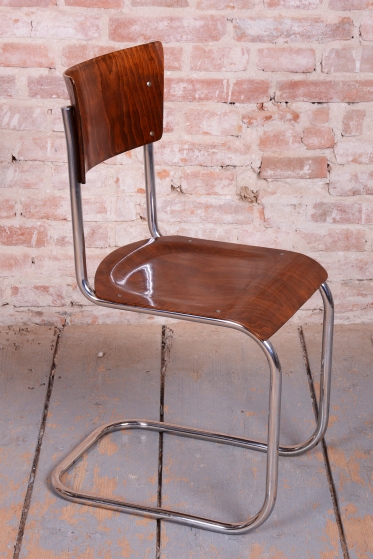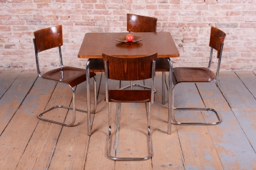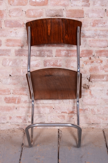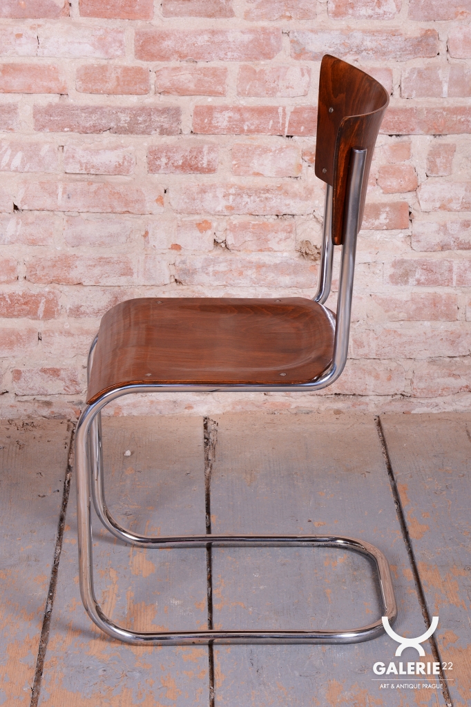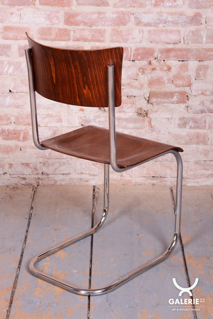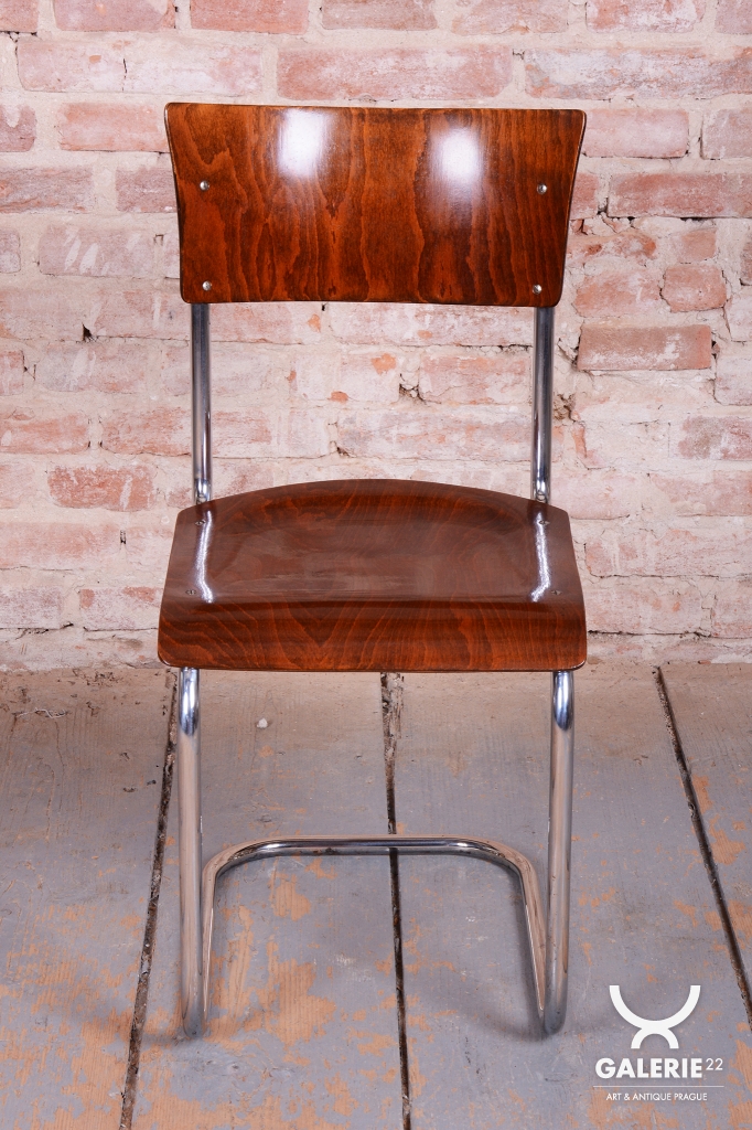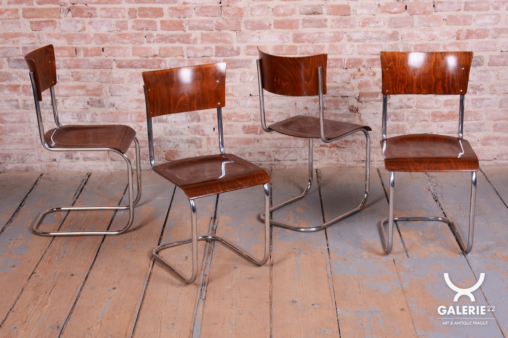 Tato sada čtyř židlí představuje ikonický příklad stylu Bauhaus, který vznikl v Československu ve 30. letech 20. století. Židle se vyznačují elegantní konstrukcí z chromované trubkové oceli, kterou vkusně doplňuje sedák a opěrka z bukové překližky.