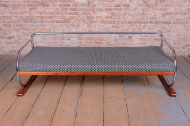 Konstrukce pohovky je zhotovena z trubkové chromované oceli, jež byla odborně vyčištěna a přeleštěna. Součástí konstrukce je také pružný drátěnkový rošt, který vynáší jednodílnou matraci. Ta je speciálně upravena tak, aby se zabránilo prověšení v místě usednutí. Nohy a lišta z bukového dřeva mají oživenou původní polituru, což dodává hřejivý a přírodní prvek.