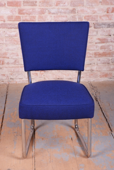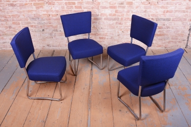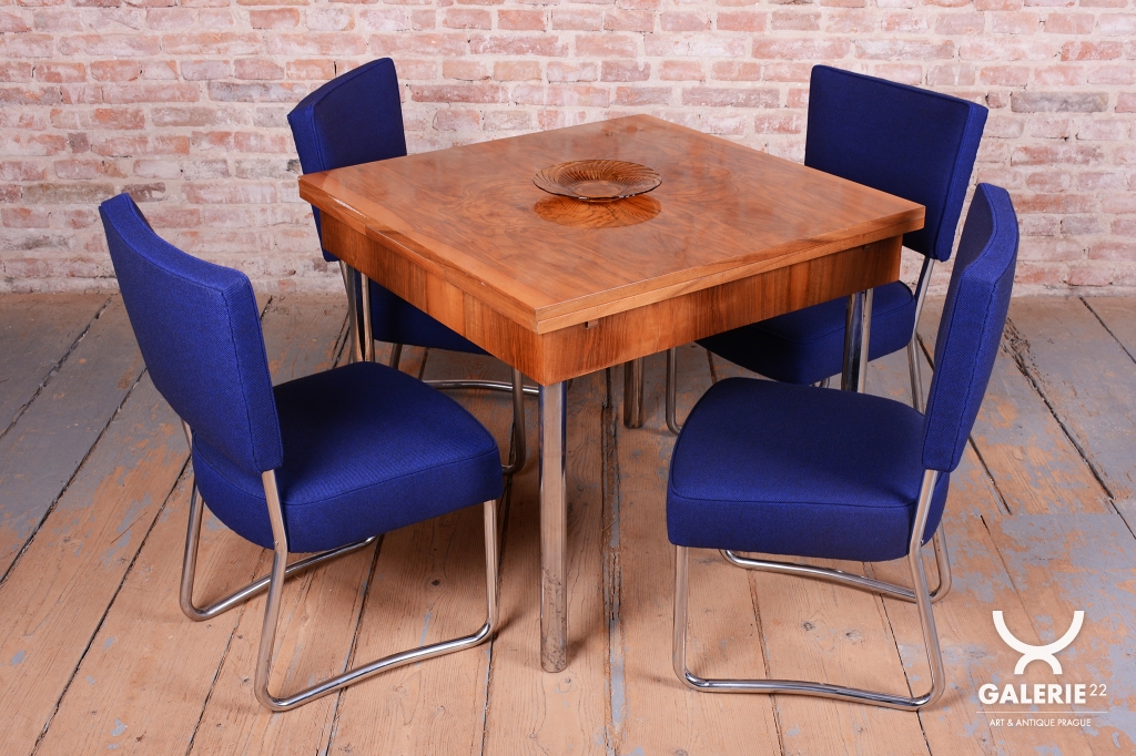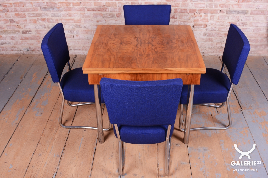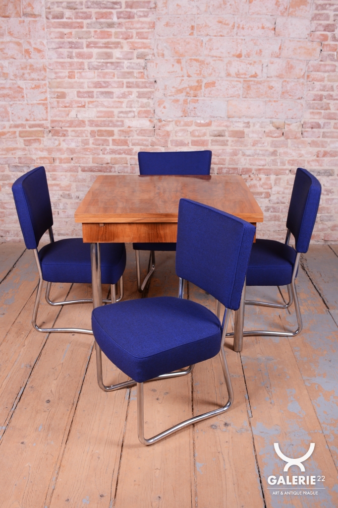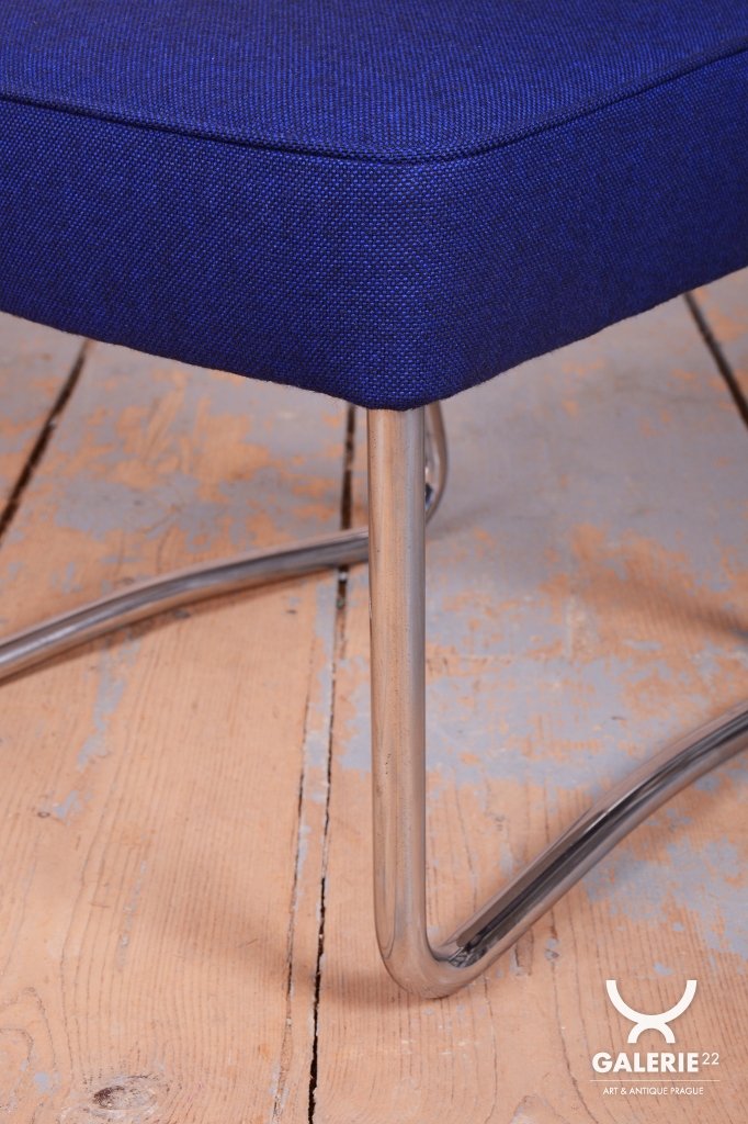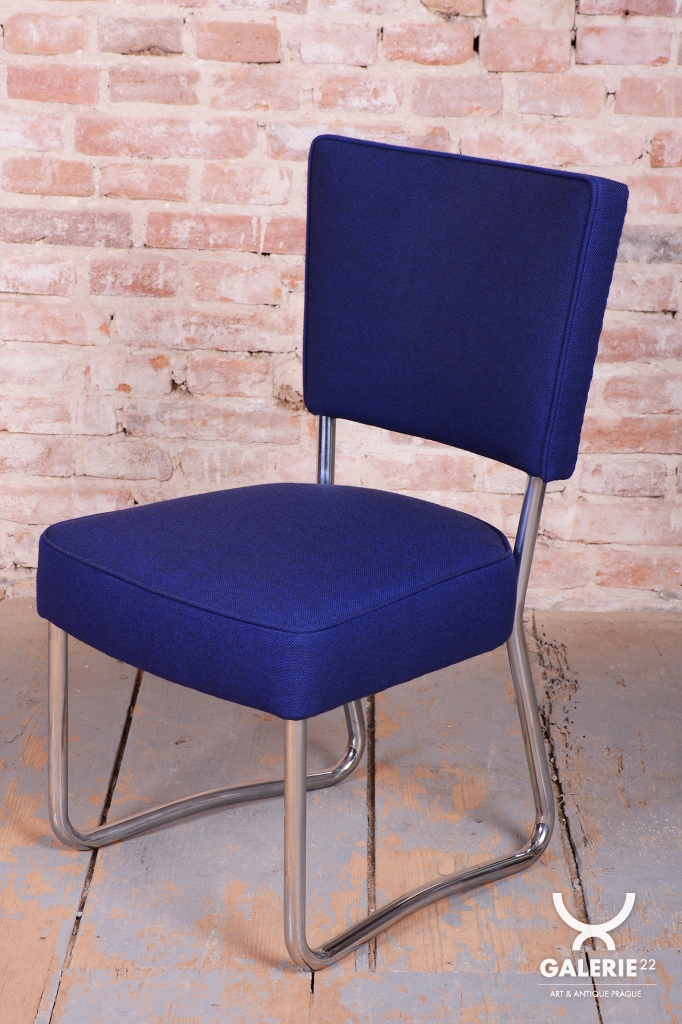 Tato exkluzivní sada 4 kusů židlí je špičkovým zástupcem funkcionálního stylu Bauhaus a byla vyrobena ve 30. letech 20. století v prestižní továrně Hynek Gottwald. Tato československá firma byla proslulá svou precizností při zpracování ohýbaného trubkového nábytku. Základem židlí je elegantní, a přesto velmi stabilní konstrukce z chromované oceli, která prošla v rámci restaurování profesionálním vyčištěním, aby získala zpět svůj charakteristický zrcadlový lesk.