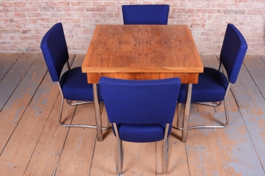 Židle byly v rámci celkové obnovy nově a odborně čalouněny, přičemž byl kladen maximální důraz na dodržení původní předlohy, a to jak z hlediska tvaru, tak kvality zpracování. Díky tomu si nábytek zachoval svůj autentický dobový vzhled při zajištění maximálního komfortu moderního uživatele. Set je plně funkční, s pevnou konstrukcí bez vůlí a představuje ideální volbu pro ty, kteří hledají spojení ikonického designu a každodenní použitelnosti u jídelního či pracovního stolu.