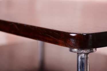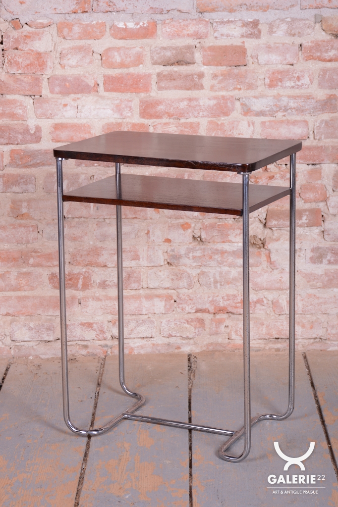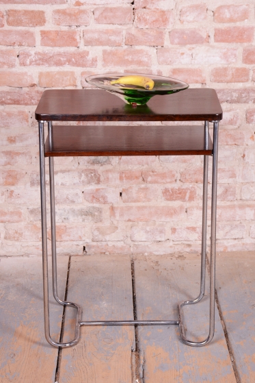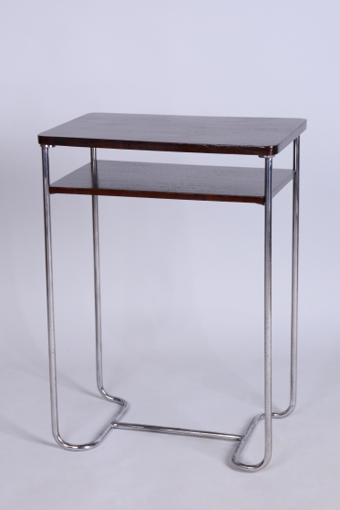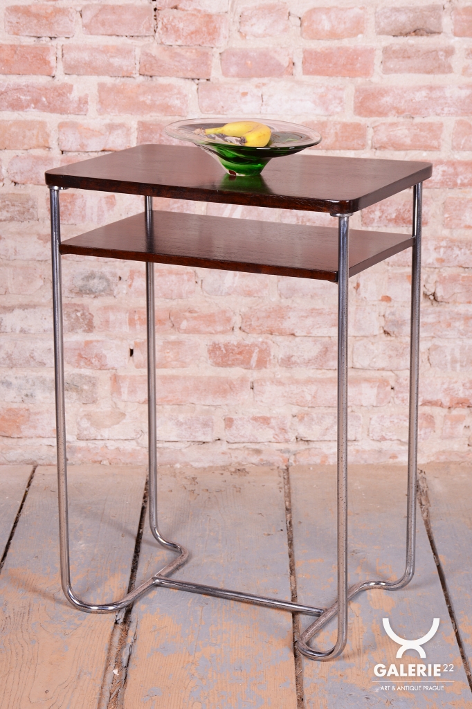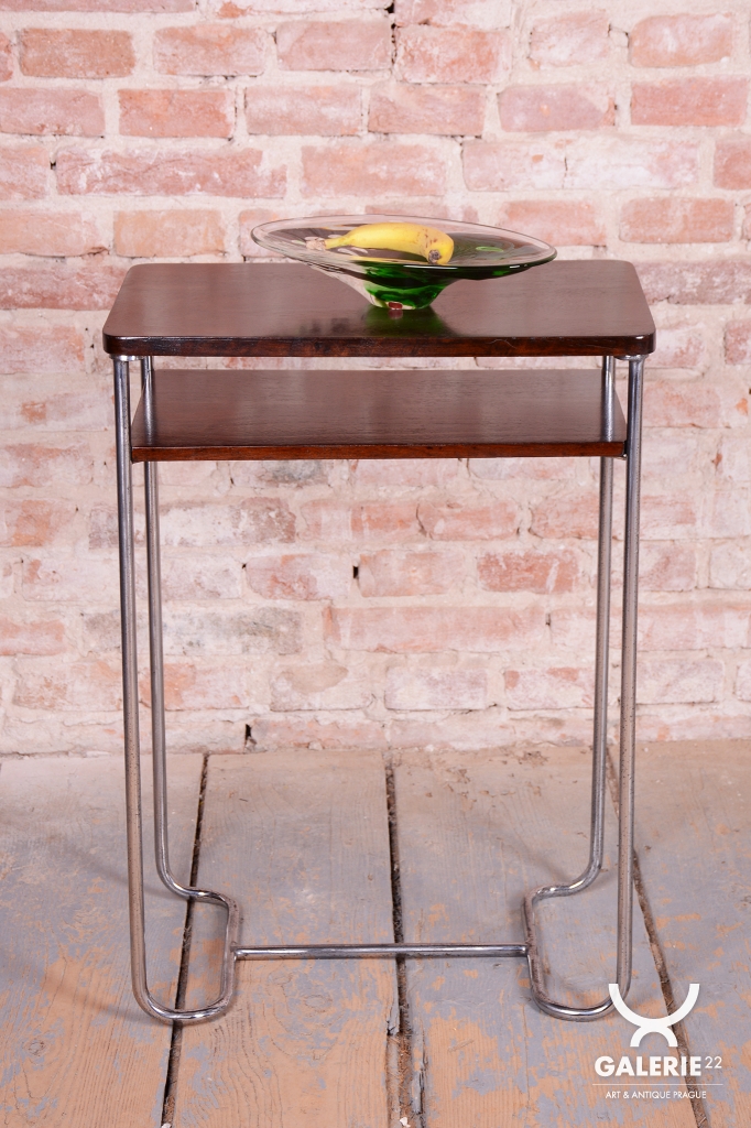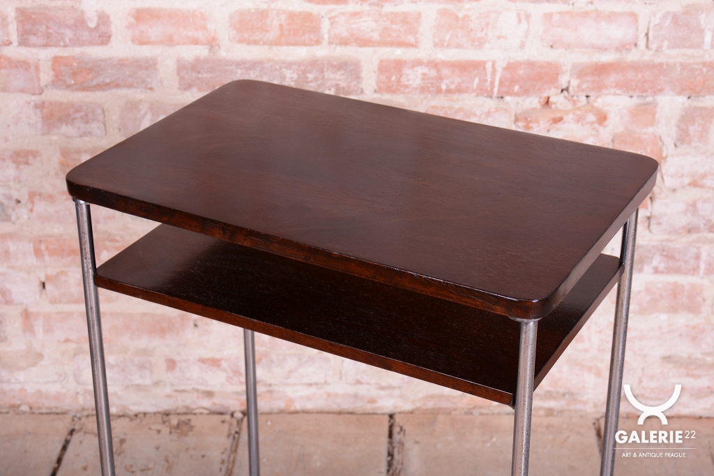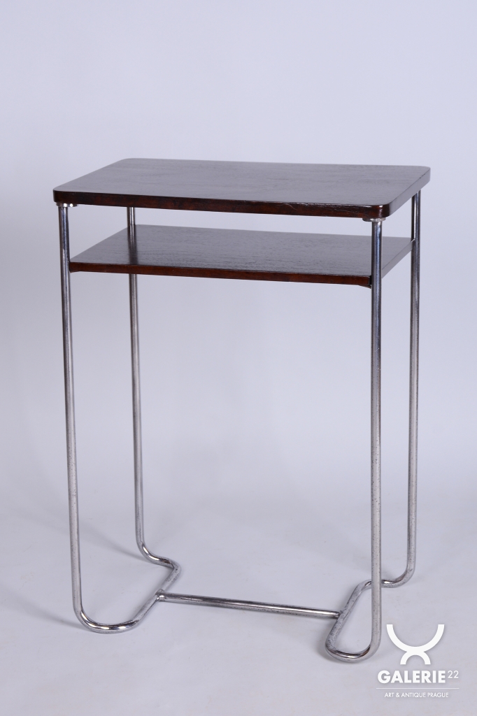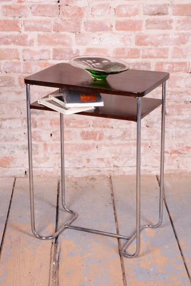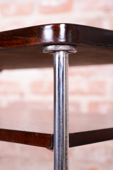 Tento elegantní Bauhaus odkládací stolek pochází z Československa z první poloviny 20. století. Je vyroben z trubkové chromované oceli a smrkové laťovky dýhované tmavým ořechem. Stolek zaujme svým nadčasovým designem a precizním řemeslným zpracováním. Výrobcem je firma Mücke-Melder.