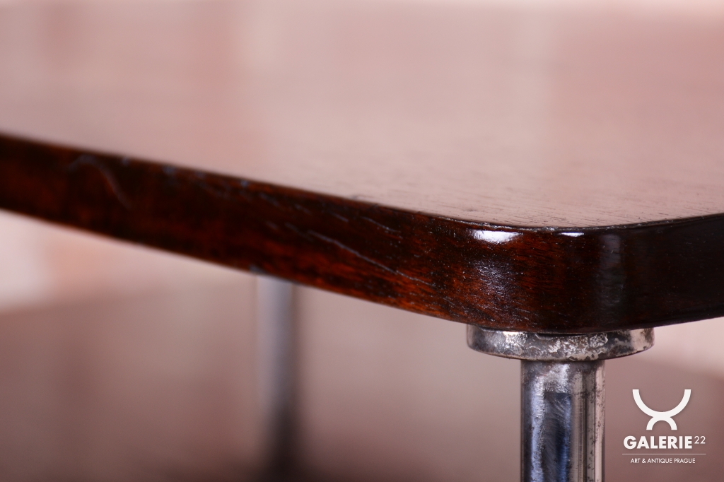 Stolek prošel pečlivou renovací, během níž byl chrom profesionálně vyčištěn a politura oživená. Tento Bauhaus odkládací stolek je ideální pro ty, kteří hledají nábytek s historií a stylem. Je to krásný a funkční kus nábytku, který bude ozdobou každého interiéru.