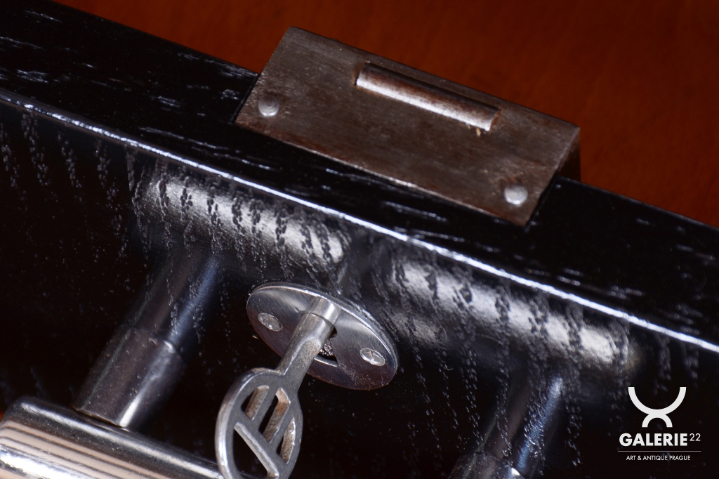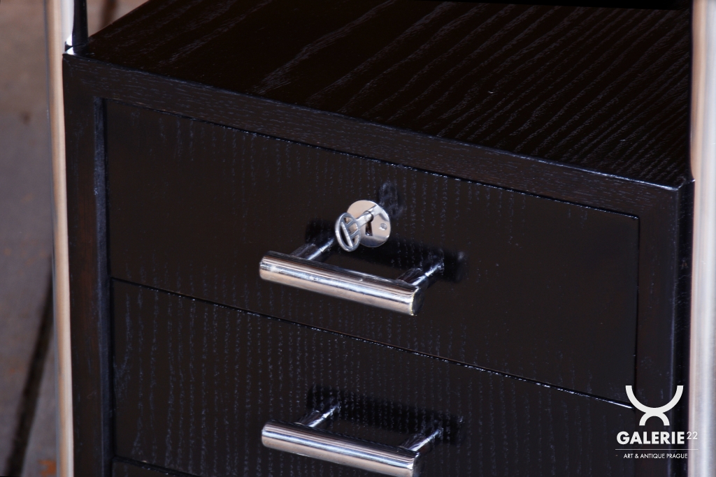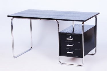 Tento elegantní psací stůl ve stylu Bauhaus pochází z Československa z 30. let 20. století a byl vyroben renomovanými Závody Roberta Slezáka. Ztělesňuje minimalistický a funkční design, typický pro toto období.