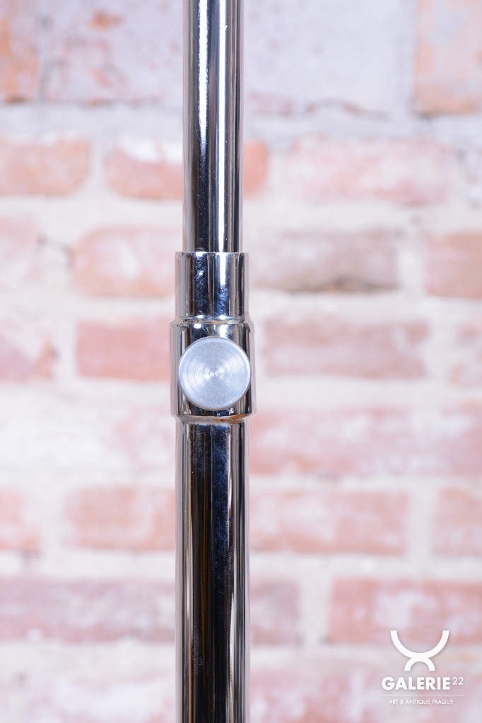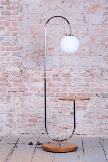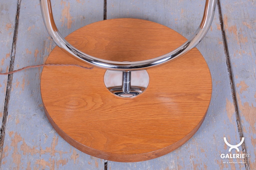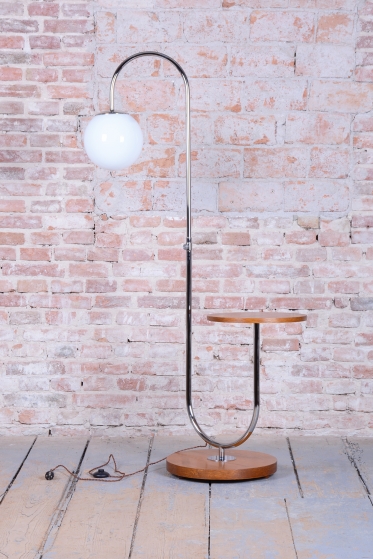Tato elegantní podlahová lampa ve stylu Bauhaus pochází z Československa z 30. let 20. století. Je dílem renomovaného výrobce Slezák, který se proslavil svým funkcionalistickým nábytkem.