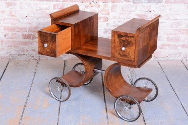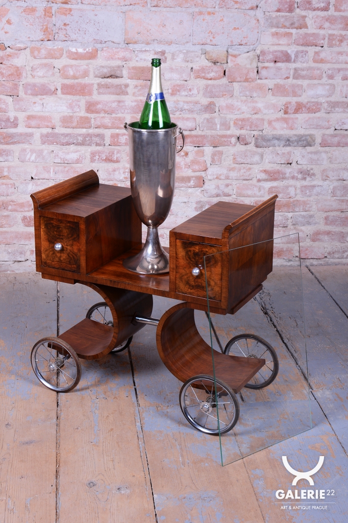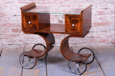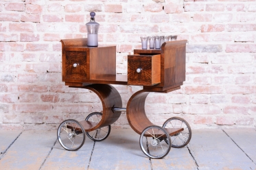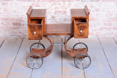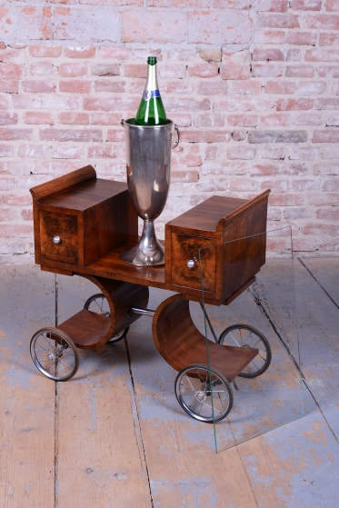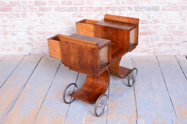 Tento elegantní servírovací stolek ve stylu Art Deco pochází z Francie a datuje se do 20. let 20. století. Je ztělesněním luxusu a praktického designu, typického pro toto období.