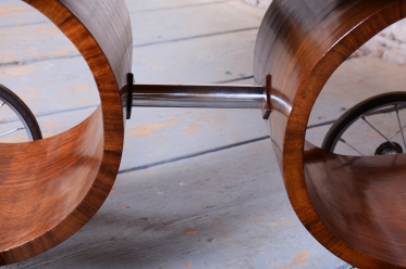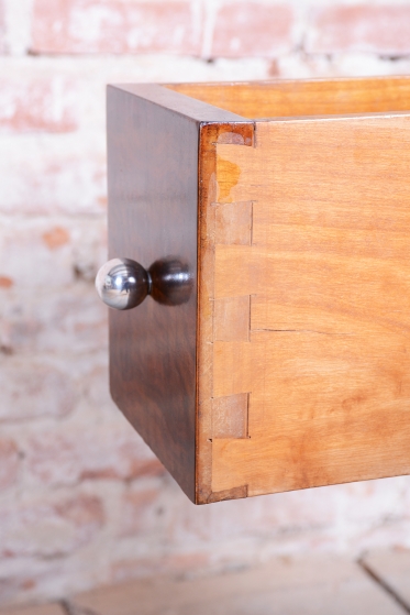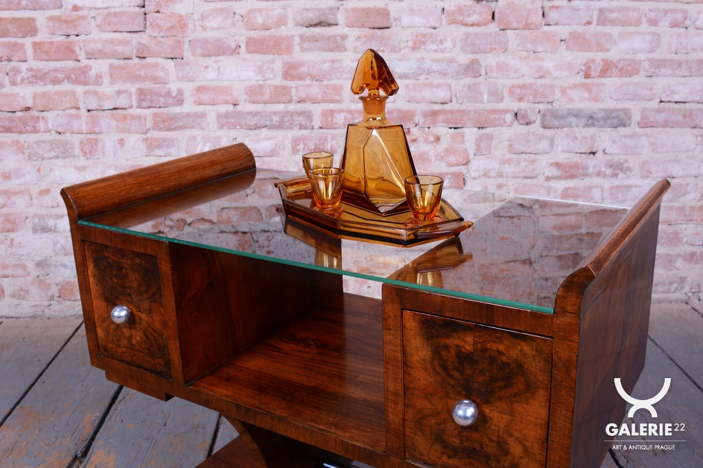 Stolek je dýhován bohatou ořechovou dýhou, která se pyšní výraznou a krásnou kresbou dřeva. Vyznačuje se praktickými oboustrannými šuplíky, které jsou opatřeny madly z chromované oceli, jež podtrhují modernistickou estetiku. Stolek má také odnímatelné sklo, které chrání povrch a usnadňuje údržbu.