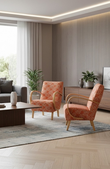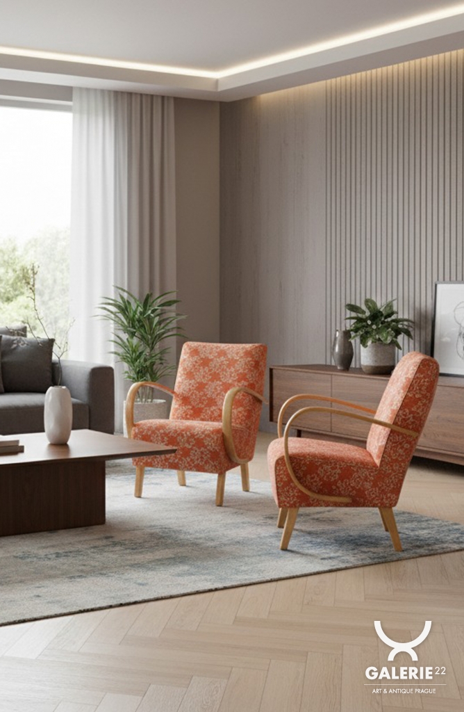 Tento pár křesel ve stylu Art Deco pochází z počátku 20. století a je spojen se jménem Jindřicha Halabaly a UP Závody, které patřily k vrcholům československého nábytkového designu. Křesla mají područky z masivního ohýbaného buku, což podtrhuje mistrovské řemeslné zpracování a nadčasovou estetiku, typickou pro toto období.
