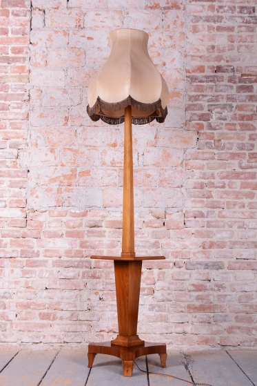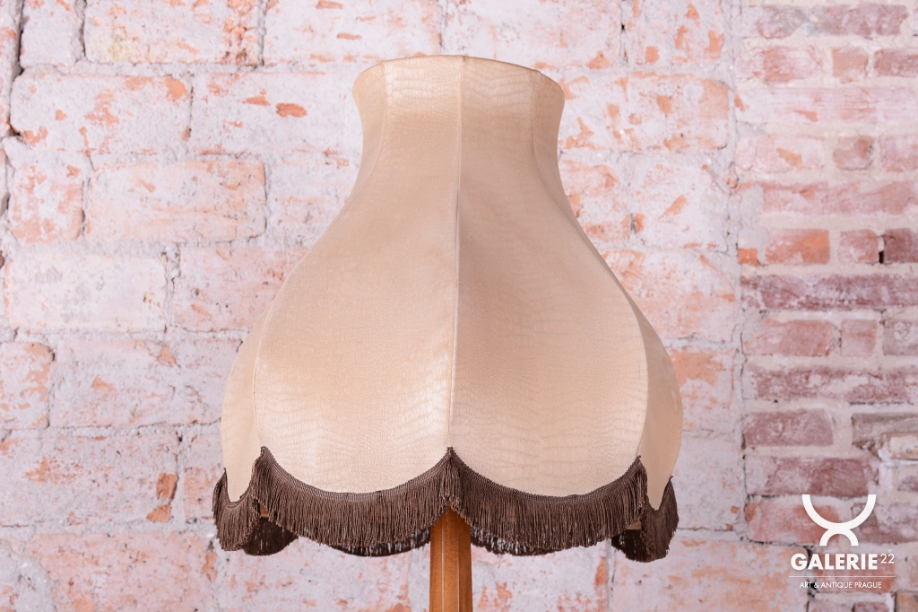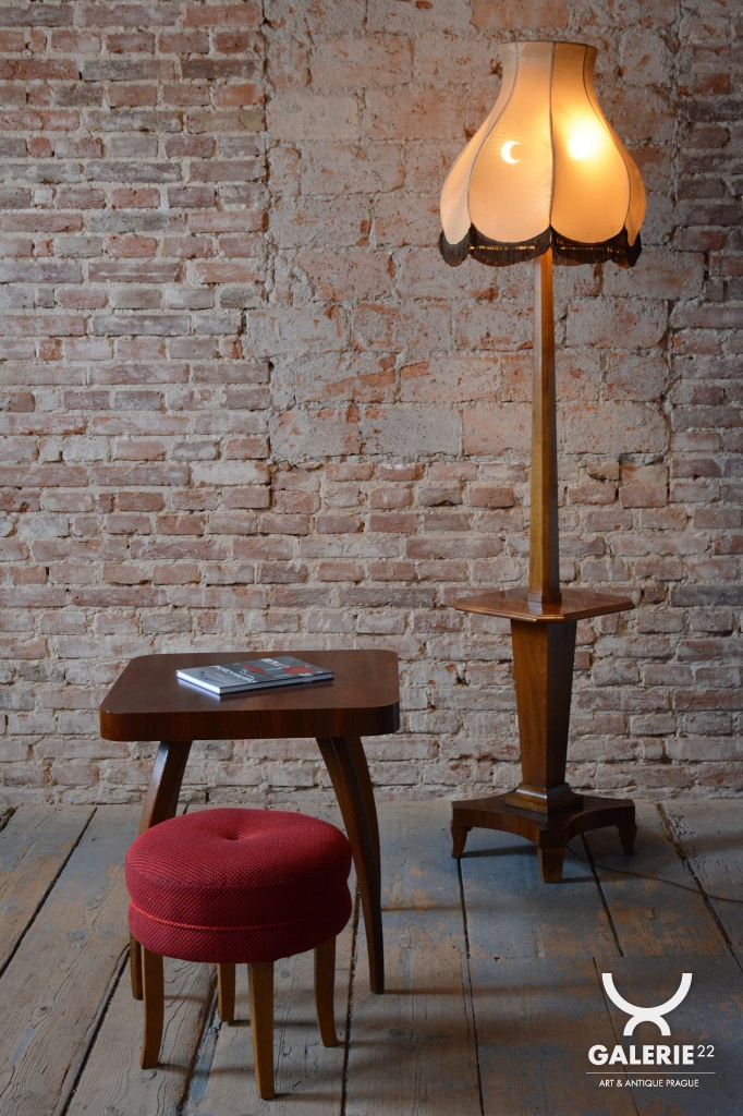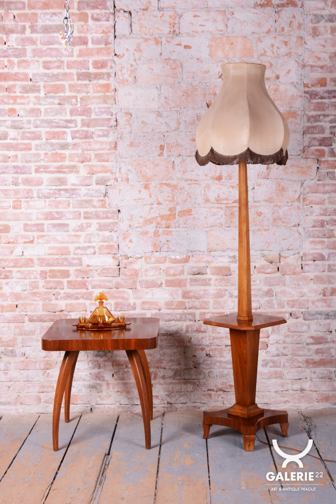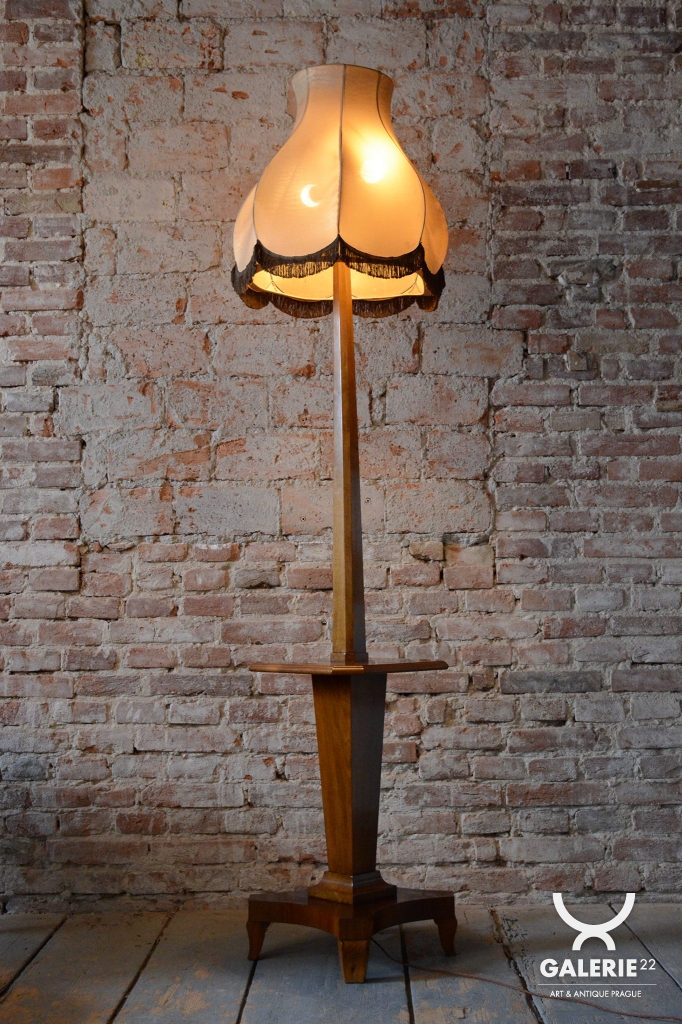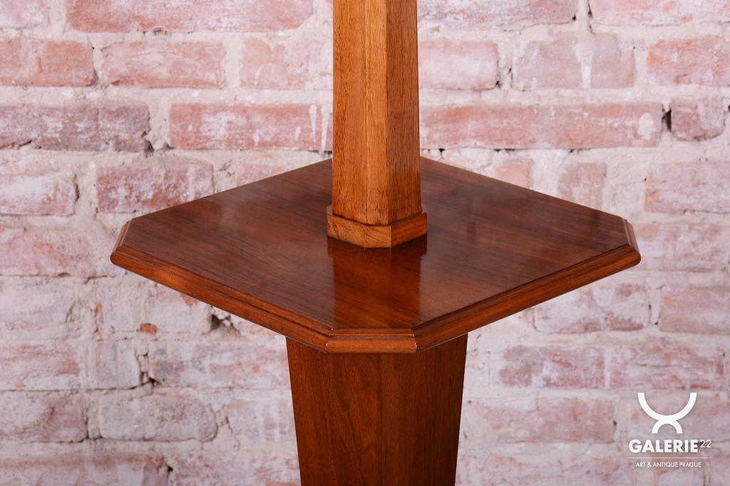 Tato elegantní podlahová lampa ve stylu Art Deco pochází z Československa z 20. let 20. století. Je zhotovena z ořechového masivu a ořechové dýhy, což jí propůjčuje bohatý a nadčasový vzhled s krásnou kresbou dřeva.