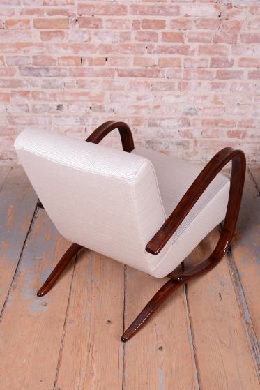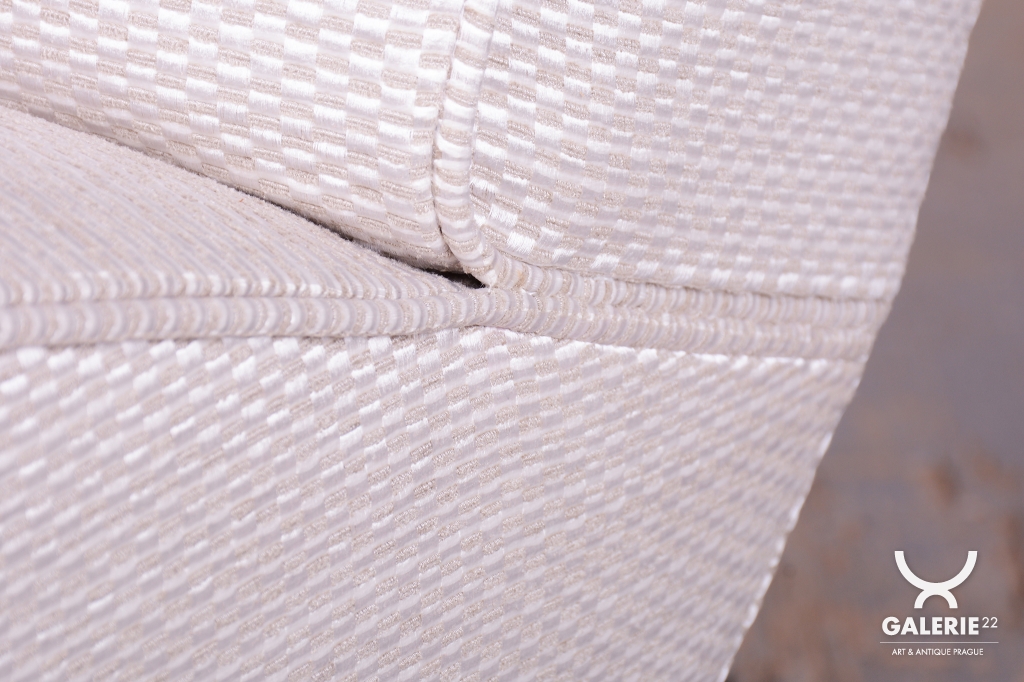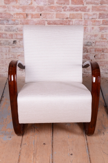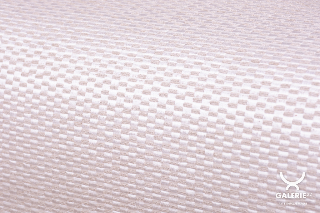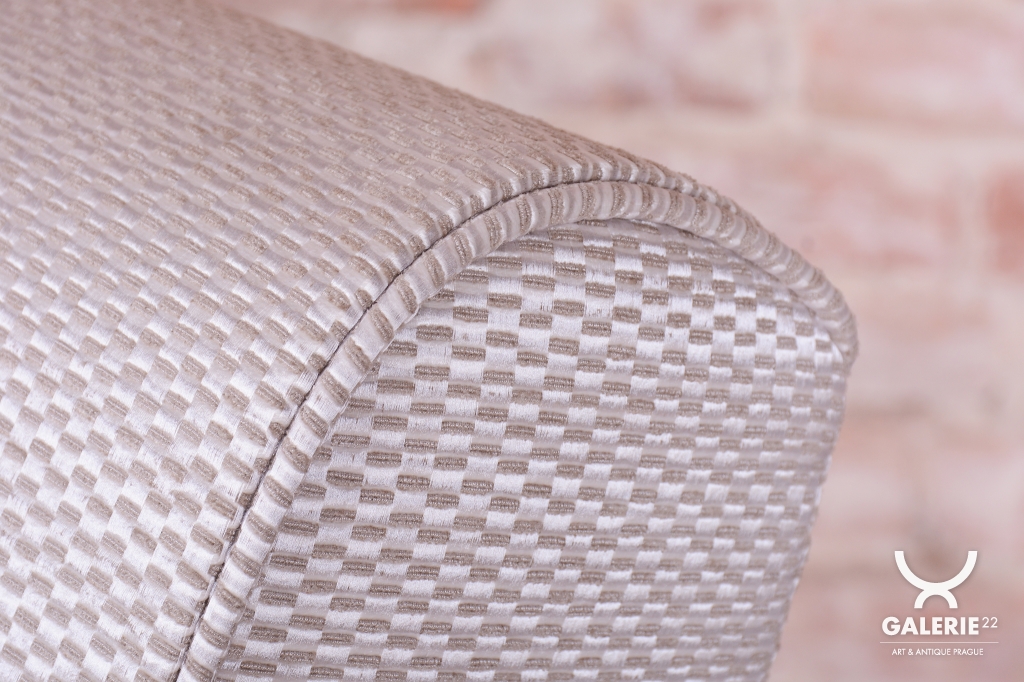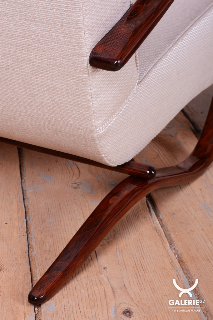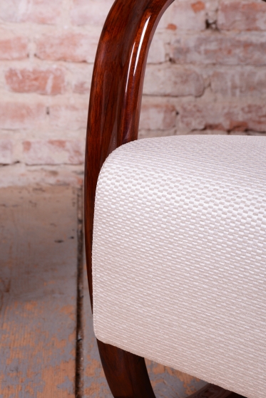 Jejich elegantní a nadčasový tvar s ohýbanými bukovými područkami a ideální úhel opěráku zaručují výjimečně pohodlné posezení. Dřevěné područky jsou nově ošetřené pianovým lakem, vyleštěným do vysokého lesku, což podtrhuje jejich noblesu a přirozenou krásu. Křesla mají nové profesionální čalounění, které bylo provedeno dle původních postupů a s použitím velmi kvalitní potahové látky od renomované francouzské značky Pierre Frey.