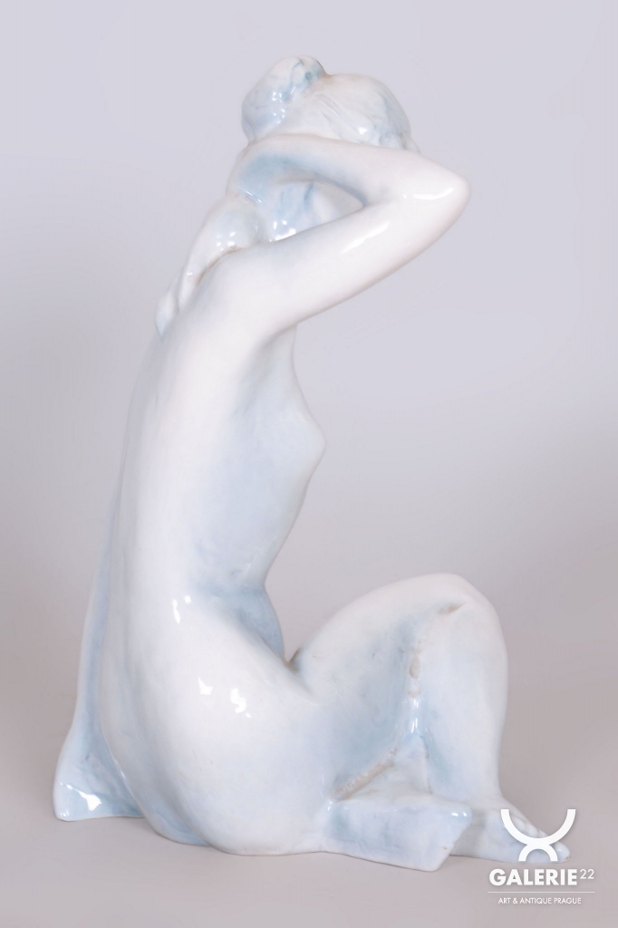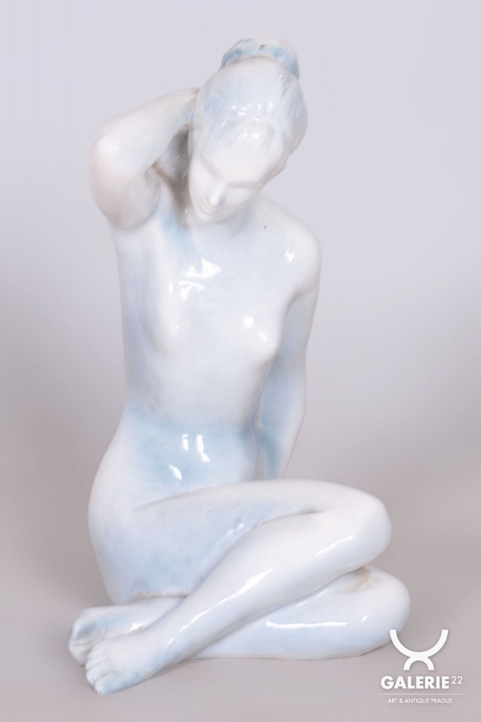 Tato keramická socha představuje elegantní dívčí akt a je signovaným dílem významného československého keramika Bohumila Kokrdy. Plastika pochází z poloviny 20. století a stylově stojí na pomezí pozdního Art Deca a nastupujícího bruselského stylu (Mid-Century Modern). Půvabná figura sedící dívky v hlubokém zamyšlení se vyznačuje plynulými, čistými liniemi a jemnou stylizací, která je pro Kokrdovu tvorbu charakteristická.
