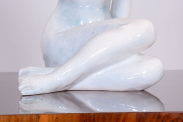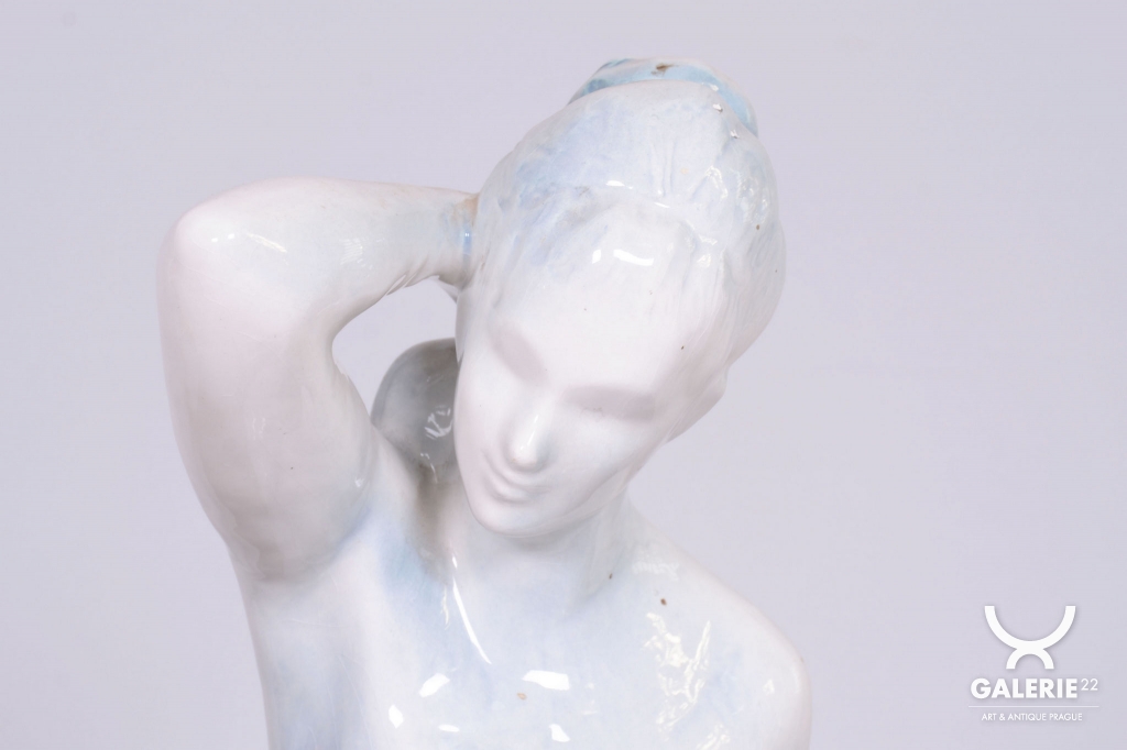 Dílo je vyrobeno z glazované keramiky, přičemž použitá glazura v teplém slonovinovém odstínu s jemným polomatným leskem dává vyniknout precizní modelaci a hře světla a stínu na povrchu těla. Socha je ponechána v původním, perfektně zachovalém stavu, bez jakýchkoliv poškození či restaurátorských zásahů, což zvyšuje její sběratelskou hodnotu. Signatura autora je jasně viditelná na spodní straně podstavce.