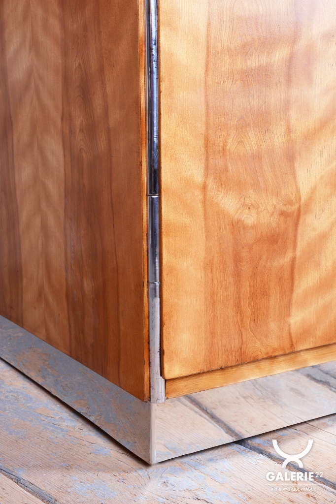 Skříň je zarámována v elegantních profilech z trubkové chromované oceli. Sokl skříně je z pochromovaného plechu, který vizuálně nadlehčuje mohutný korpus. Zásuvky jsou zhotoveny z kombinace bukového masivu a překližky, což zaručuje jejich pevnost a trvanlivost pro uložení prádla a dalších předmětů.