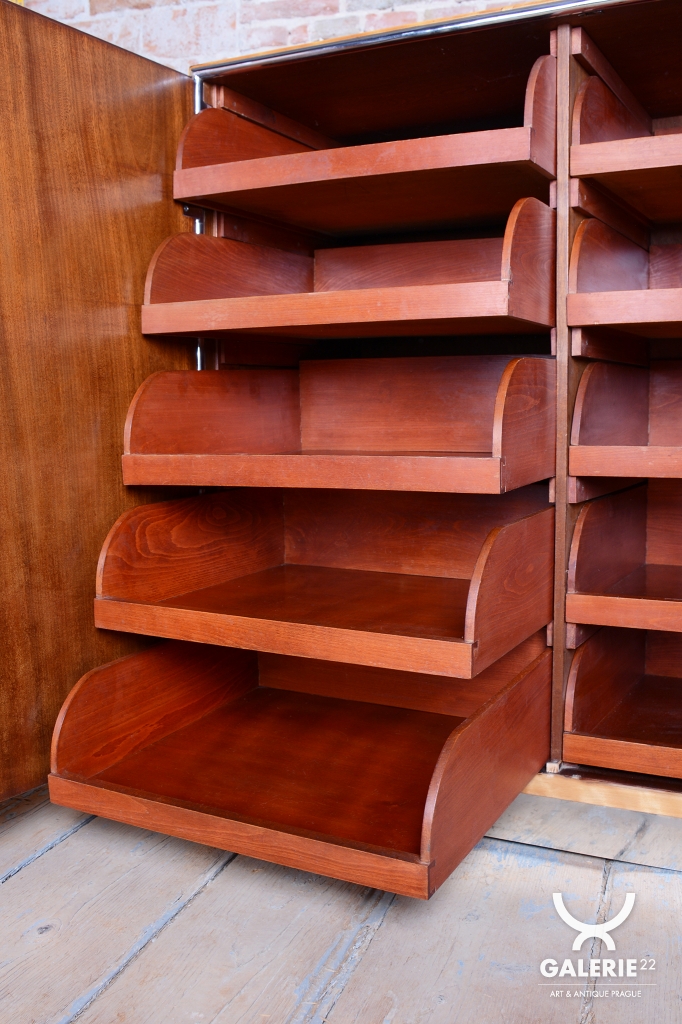 Tato unikátní zásuvková skříň (komoda) ve stylu Bauhaus pochází z Československa z 30. let 20. století a je mistrovským dílem, které je připisováno architektovi Hermannu Johnu Hagemannovi pro renomovaného výrobce Mücke Melder - Fryštát. Skříň byla původně součástí setu.