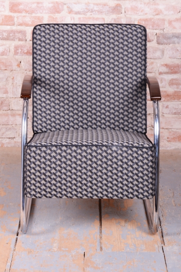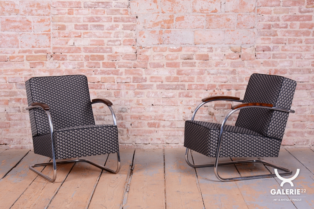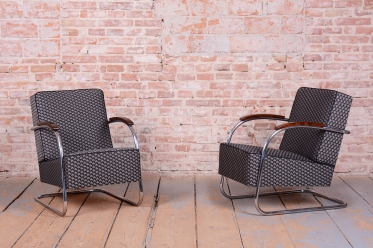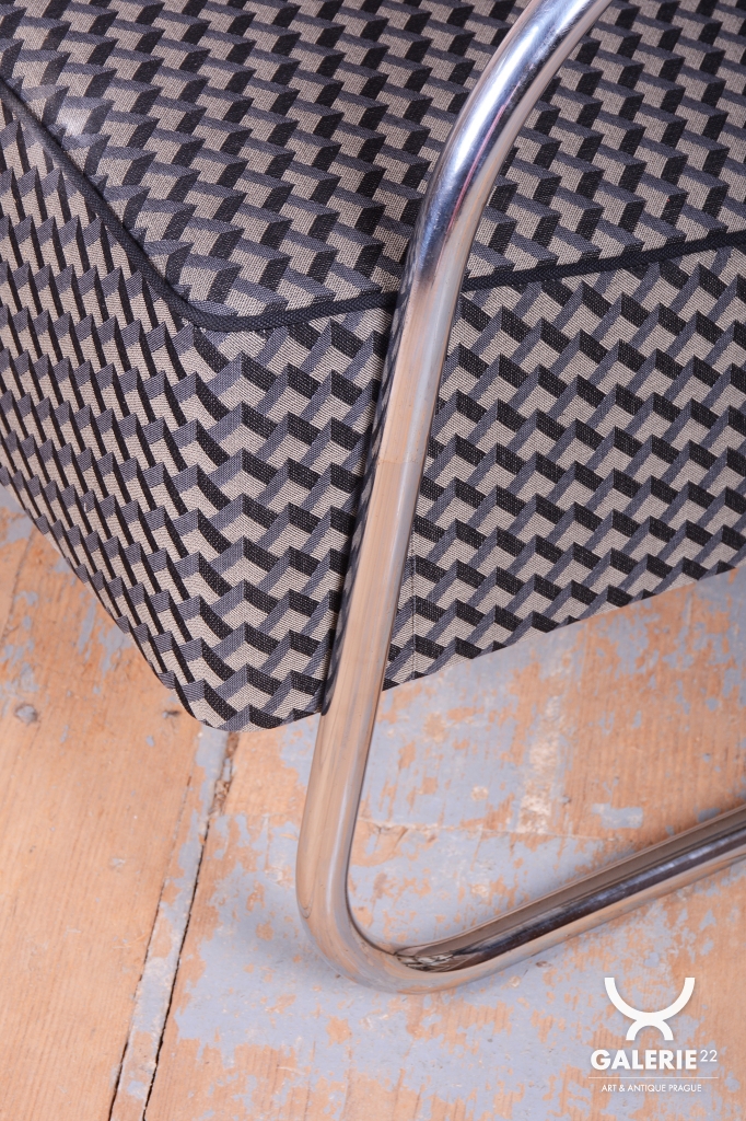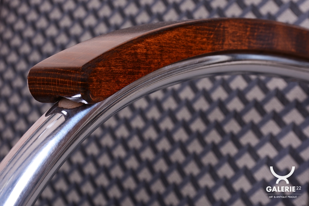 Tento ikonický pár Bauhaus křesel s trubkovou konstrukcí ve tvaru D (tzv. D-form armchair) pochází z počátku 20. století a je mistrovským dílem funkcionalistického designu. Konstrukce z chromované oceli zajišťuje pevnost a odolnost, zatímco masivní bukové područky dodávají křeslu příjemný kontrast přírodního materiálu. Čalounění bylo obnoveno kvalitní retro látkou, která podtrhuje jeho původní estetiku.