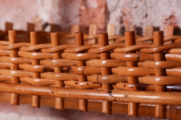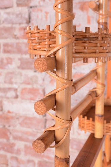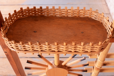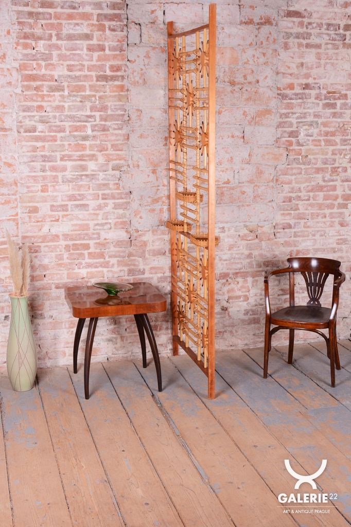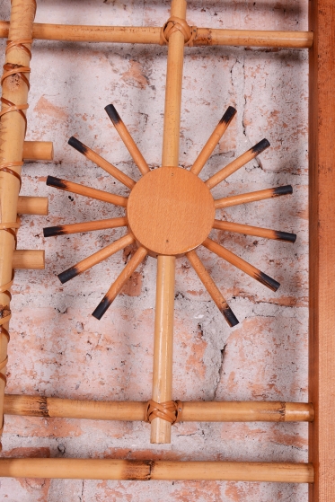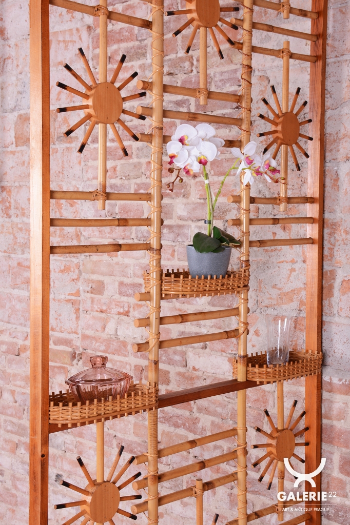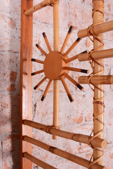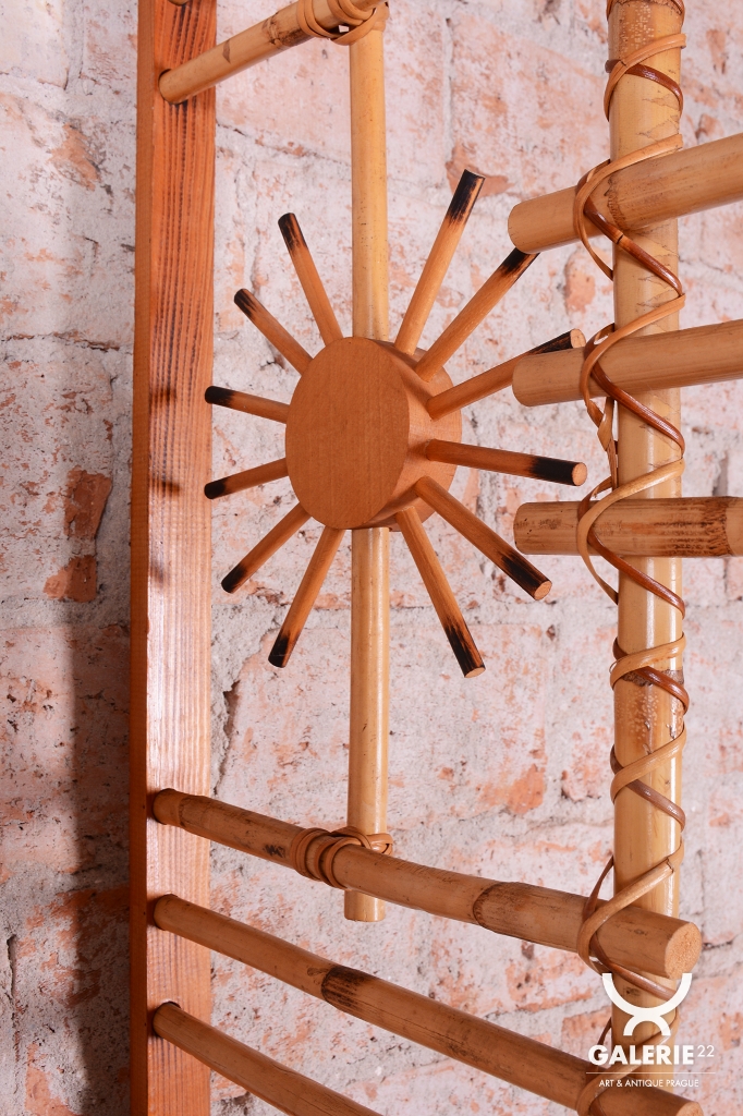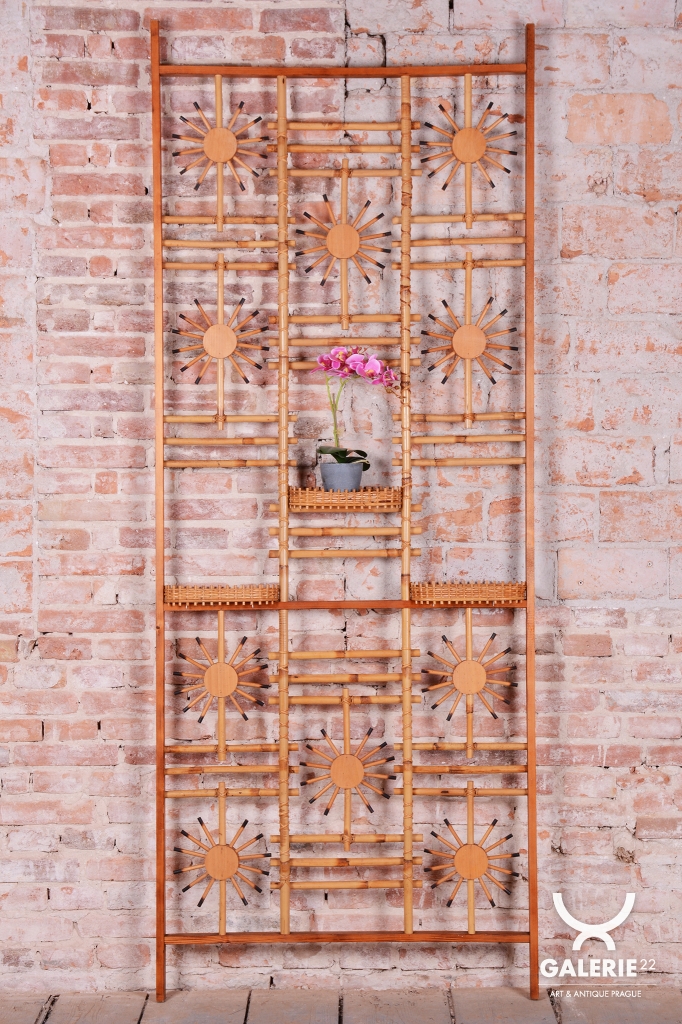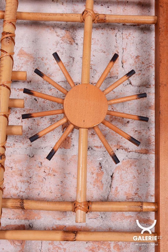 Konstrukce stěny využívá kombinaci přírodních materiálů: bukové dřevo tvoří pevný rám, zatímco výplet je mistrovsky proveden z ratanu a bambusu. Geometrická kompozice připomínající sluneční paprsky vytváří v interiéru dynamickou hru světla a stínu, aniž by prostor opticky zatěžovala. Předmět byl odborně restaurován a vyčištěn, díky čemuž si přírodní materiály zachovaly svou pružnost a původní barevnost. Je to ideální sběratelský kus pro ty, kteří oceňují přírodní materiály a příběh tradičního moravského řemesla zasazený do moderního kontextu.