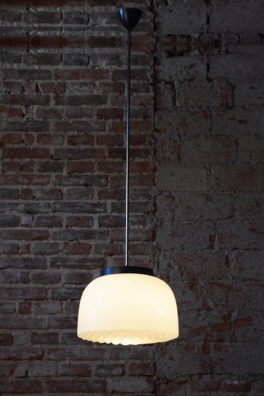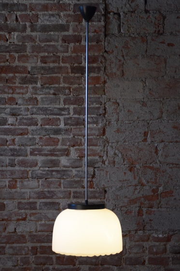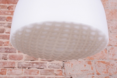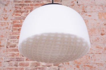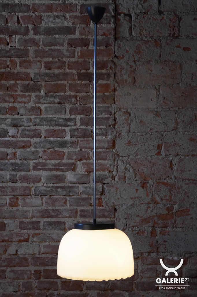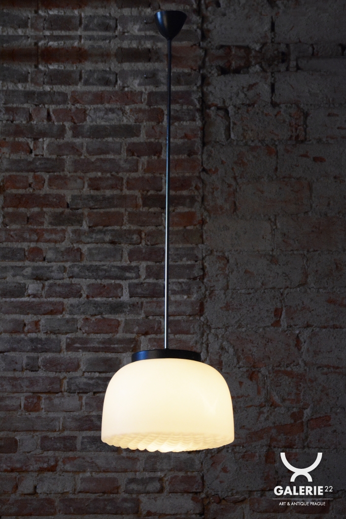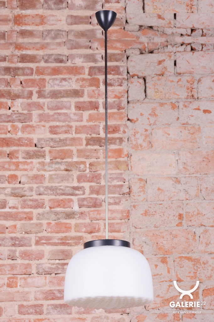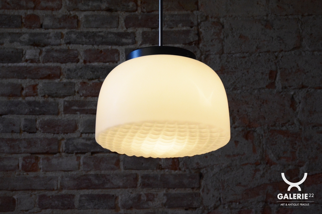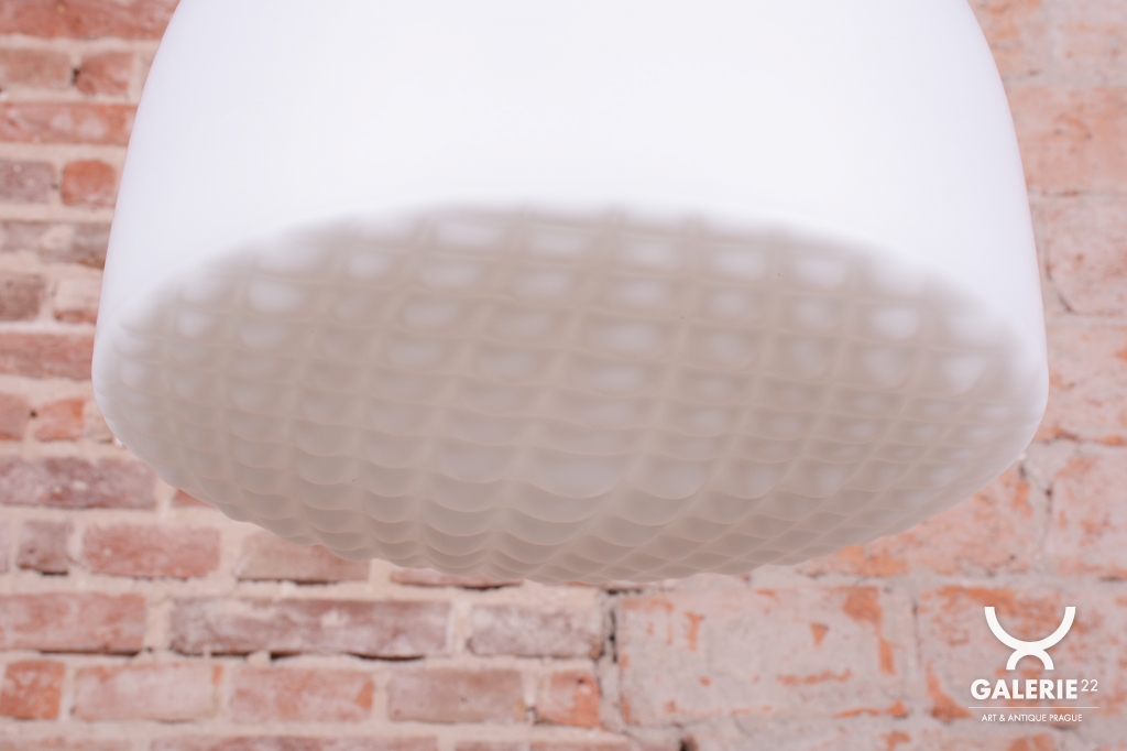 Tento nadčasový lustr je elegantním zástupcem bruselského stylu a estetikou Mid-Century modernismu, který v polovině 20. století proslavil Československo na mezinárodní scéně. Svítidlo sází na minimalistickou kombinaci materiálů a čisté geometrické tvary. Dominantou je velkorysé stínidlo z bílého opálového skla o průměru 35 cm, které v interiéru vytváří velmi měkké a harmonicky rozptýlené světlo bez oslnění.