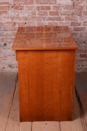 Předmět prošel odborným restaurováním, při kterém byla citlivě oživena původní politura. Konstrukce z laťovky je dýhována dubem, jehož světlá barva a výrazná struktura dodávají stolu přírodní, a přesto velmi elegantní vzhled. Stůl nabízí praktické úložné prostory v podobě zásuvek, které si zachovaly svou hladkou funkčnost. Díky svému subtilnímu provedení a vysoké kvalitě zpracování se stůl hodí do moderních interiérů i jako stylový pracovní kout v retro stylu.