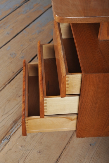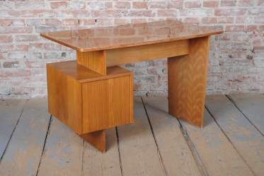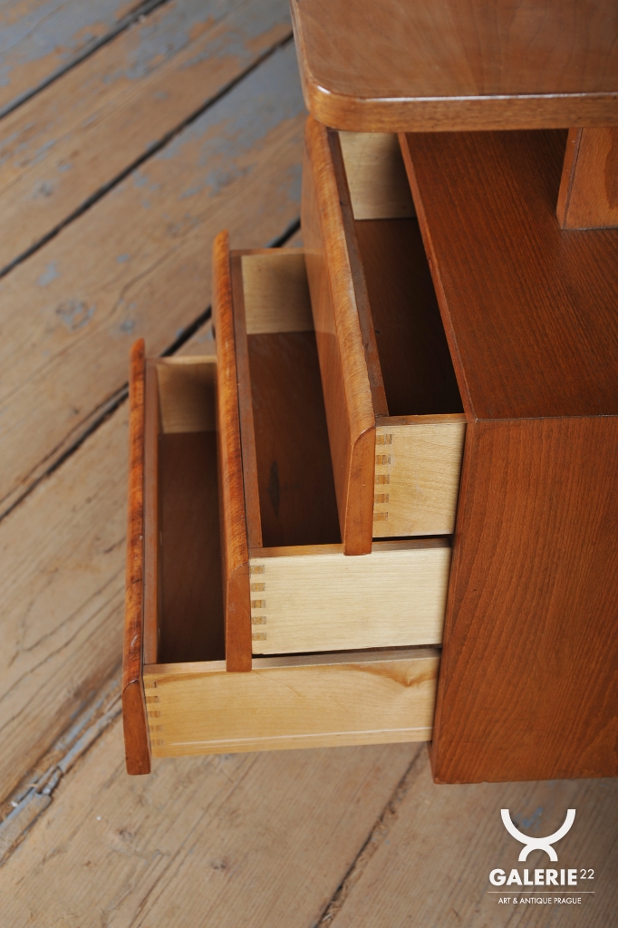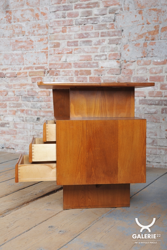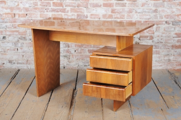 Předmět prošel odborným restaurováním, které kladlo důraz na zachování autenticity. Konstrukce z laťovky využívá atraktivní kombinaci dřevin – je dýhována ořechem a dubem. Tento kontrastní dialog tmavšího ořechu a světlejšího dubu dává stolu jedinečný vizuální rytmus. Původní politura dřeva byla citlivě oživena, díky čemuž vynikla hloubka kresby obou dřevin. Stůl nabízí praktický úložný prostor a díky své nadčasovosti a subtilnímu vzhledu je ideálním doplňkem moderních i retro interiérů.