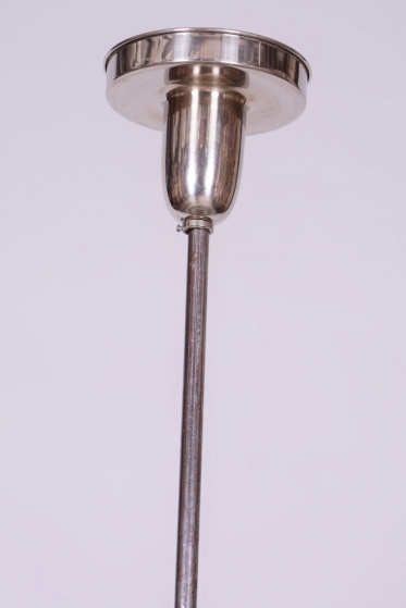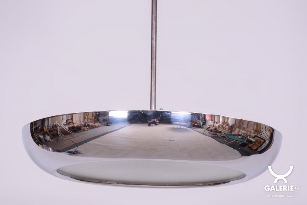 Předmět prošel odborným restaurováním, které mu navrátilo jeho původní lesk. Konstrukce z chromované oceli byla profesionálně vyčištěna. Charakteristické stínidlo z mléčného skla zajišťuje rozptýlené a neoslňující světlo. V rámci renovace byla provedena nová elektrifikace, díky čemuž je lustr připraven k okamžité instalaci a bezpečnému provozu. Jde o vysoce ceněný sběratelský kus, který tvoří stylovou dominantu každého funkcionalistického interiéru.