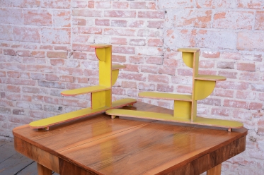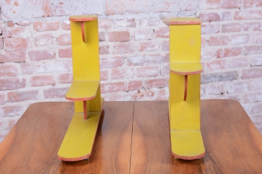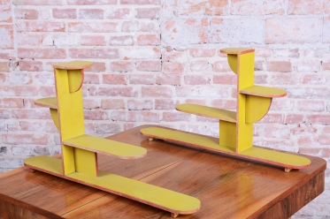 Podstavce jsou zhotoveny z lakovaného dřeva a zachovaly si svou původní a velmi dobře zachovalou barvu, což svědčí o jejich vysoké kvalitě a šetrném užívání. Byly profesionálně vyčištěny a mají stabilní konstrukci, díky čemuž jsou plně funkční a připraveny sloužit svému účelu.