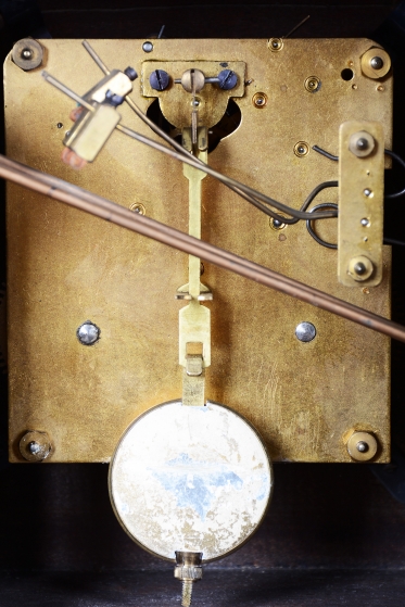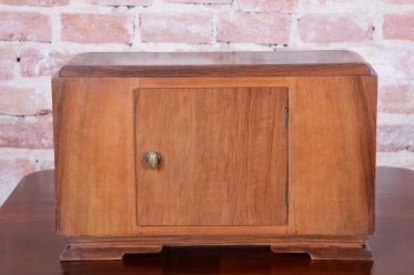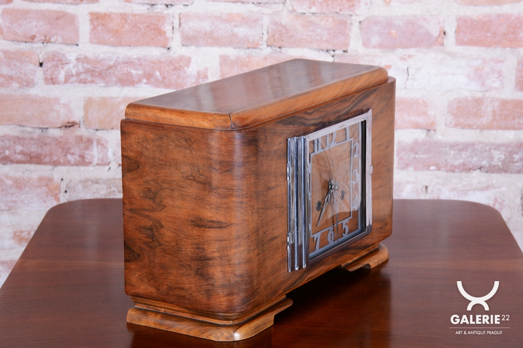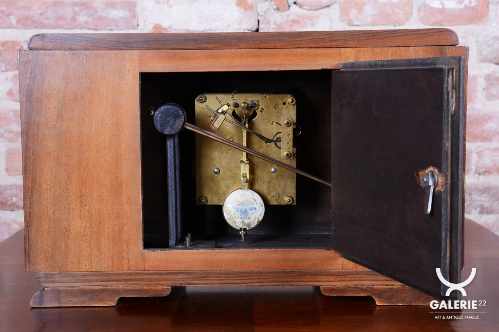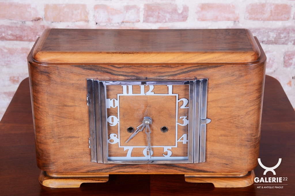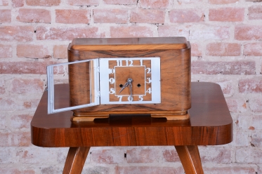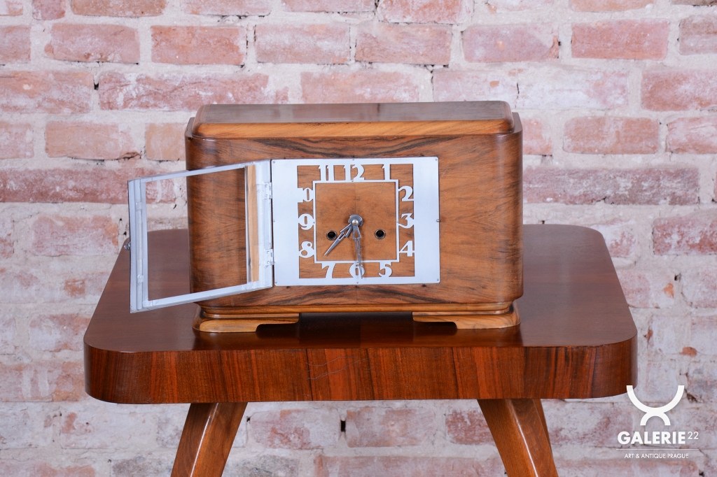 Tyto stolní hodiny jsou vytříbeným příkladem československého Art Deca 20. let 20. století. Představují éru, kdy se geometrická čistota a luxusní materiály staly standardem moderního měšťanského interiéru. Skelet hodinové skříně je vyroben z dřeva dýhovaného ořechem, jehož výrazná a bohatá kresba dodává předmětu přirozenou eleganci a vizuální hloubku.
