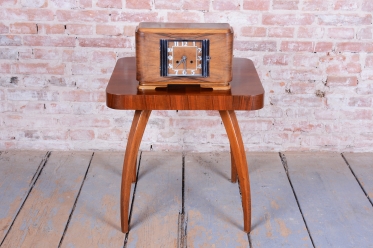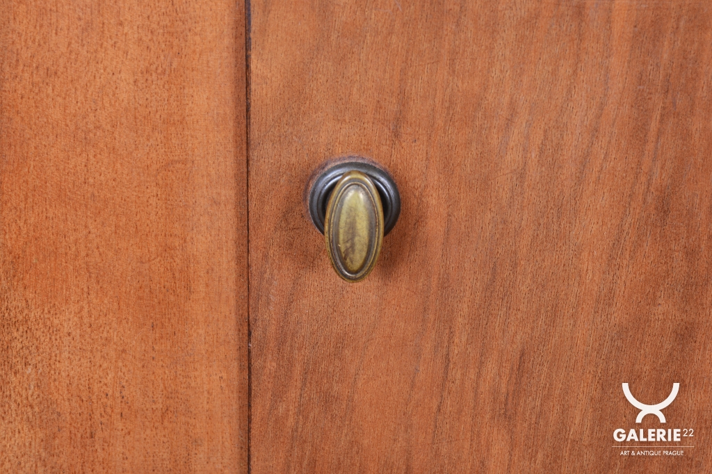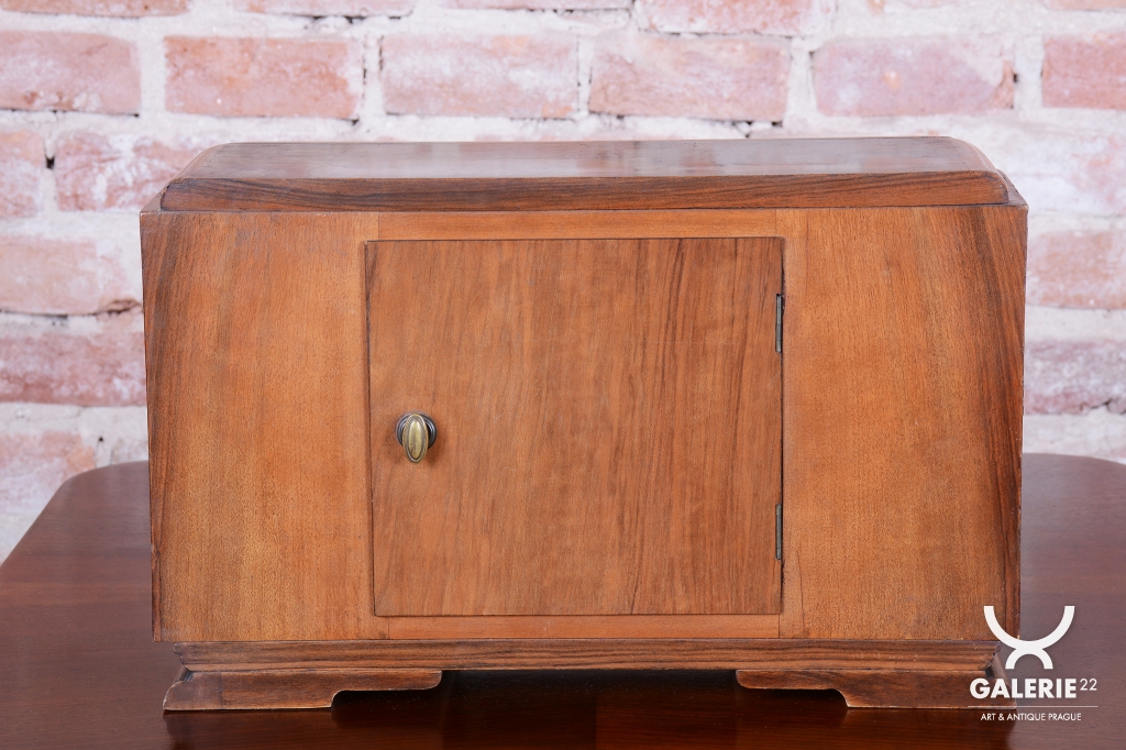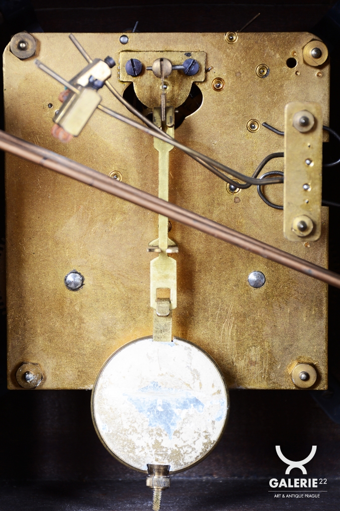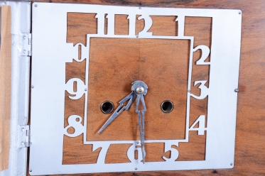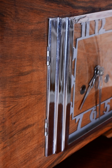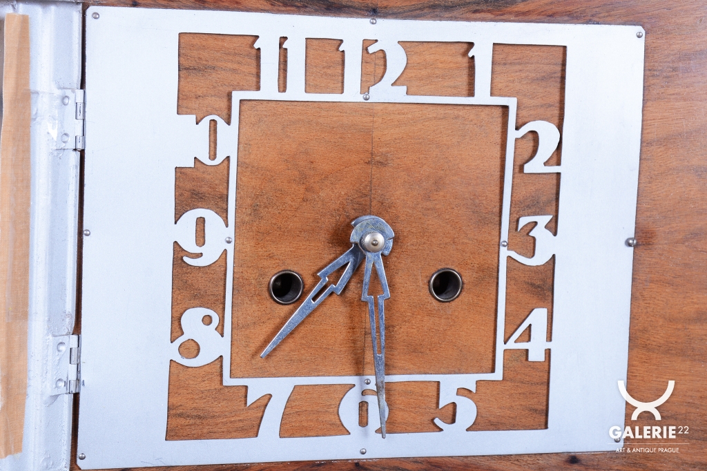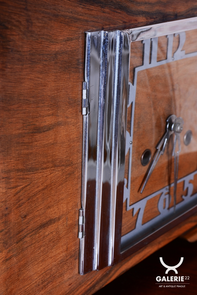 Výrazným designovým prvkem je chromovaný rámeček prosklených dvířek ciferníku, který vytváří ostrý, moderní kontrast k hřejivému odstínu ořechového dřeva. Hodiny jsou osazeny původním hodinovým strojkem, který podtrhuje autenticitu celého kusu. Předmět se dochoval v původním, velmi dobře zachovalém stavu, což je pro sběratele klíčový faktor. Tyto hodiny nejsou pouze funkčním měřičem času, ale především stylovým doplňkem, který v sobě nese atmosféru první republiky.