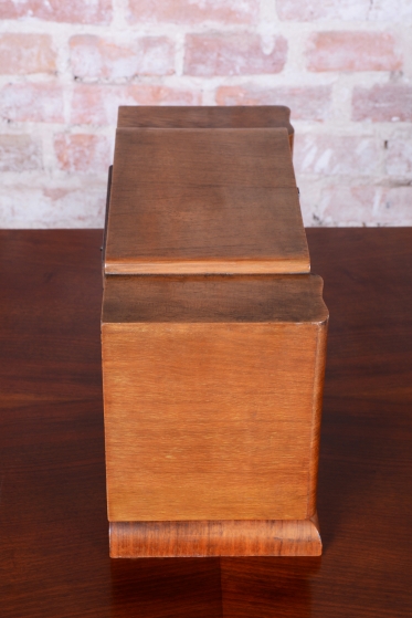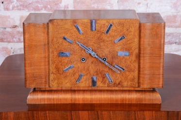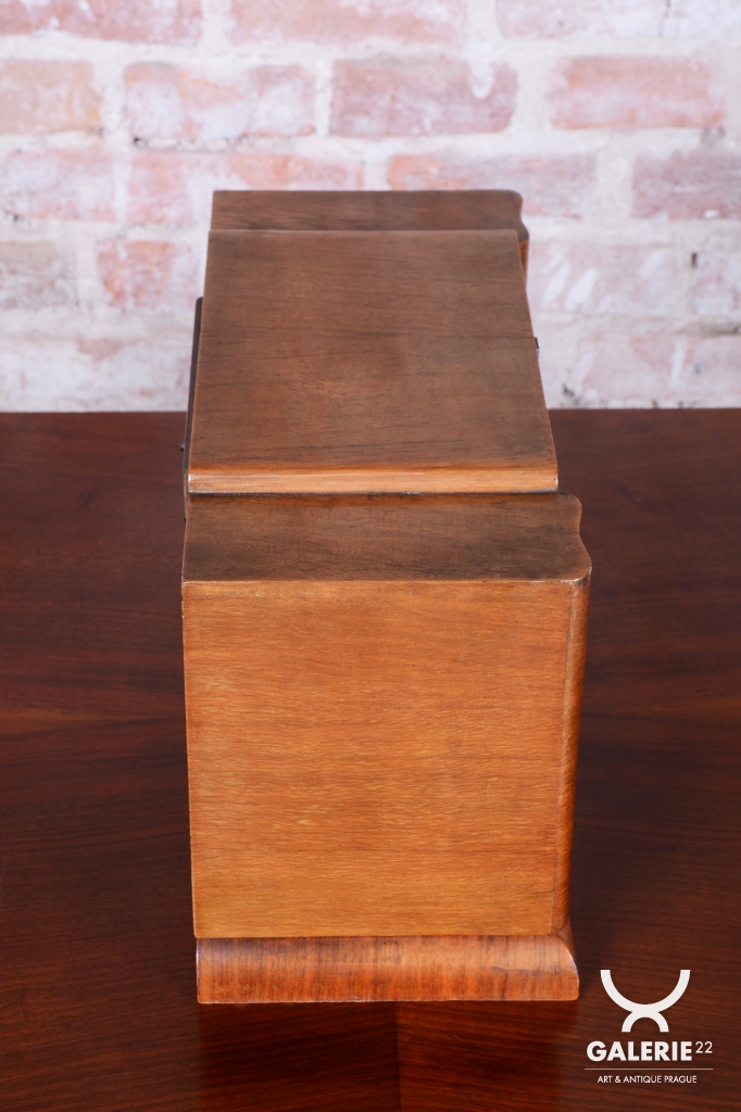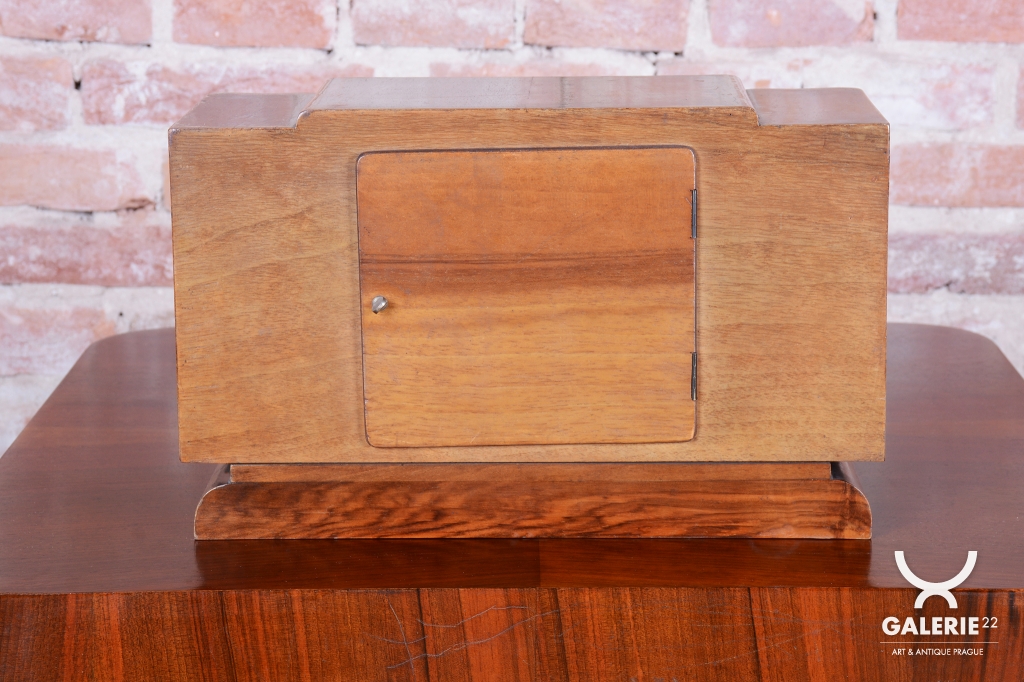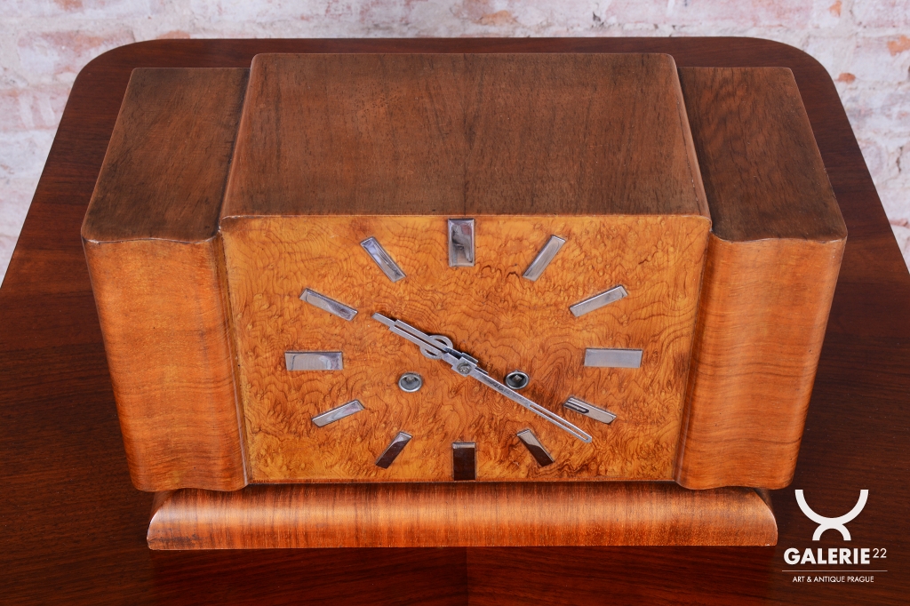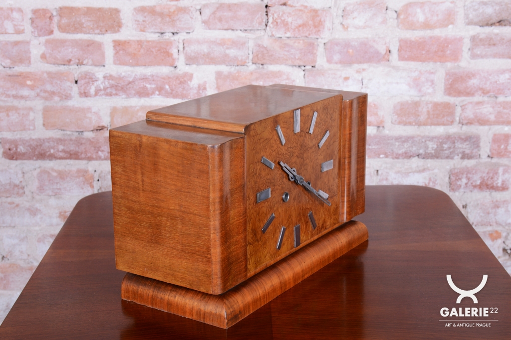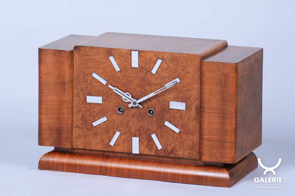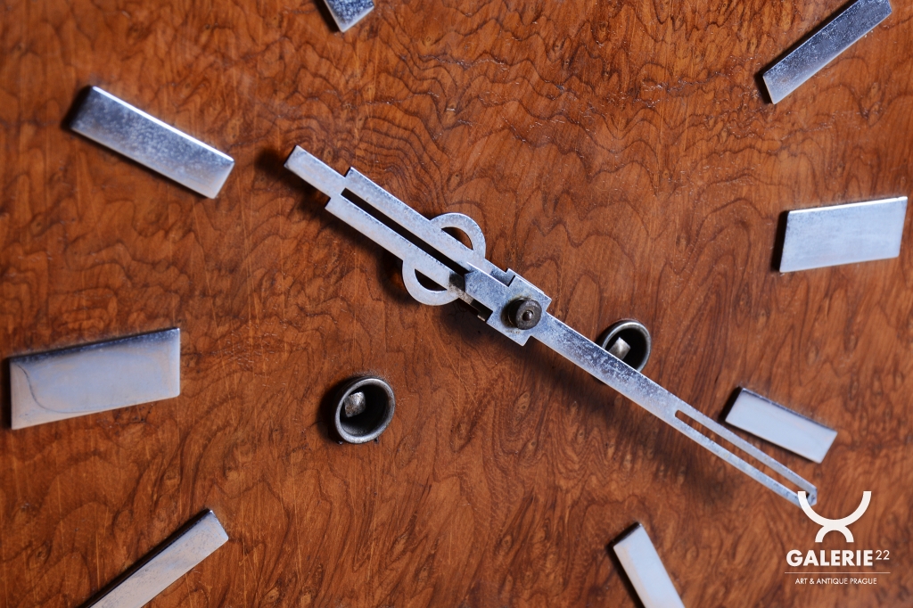 Tyto stolní hodiny jsou další vynikající ukázkou československého hodinářského designu 20. let 20. století. Jsou navrženy v přísnějším stylu Art Deco, který se zaměřuje na čistotu formy a krásu přírodních textur. Skelet skříně je vyroben z ořechem dýhovaného dřeva, které díky své hluboké kresbě a teplému odstínu dodává hodinám nadčasovou eleganci vhodnou do každého klasického i moderního interiéru.