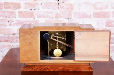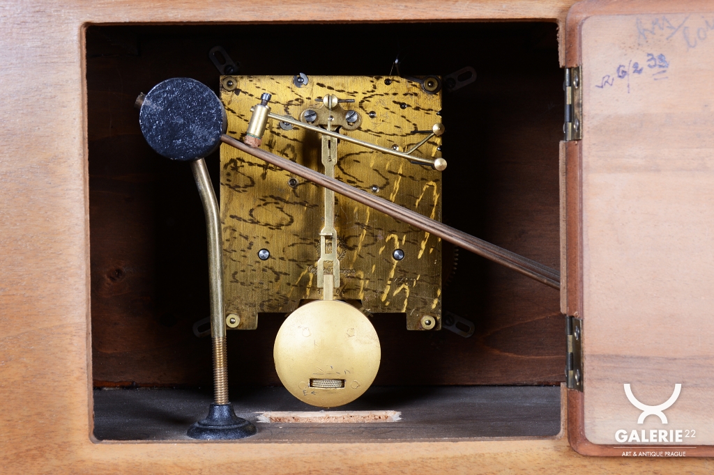 Uvnitř skříně je osazen původní hodinový strojek, což zaručuje technickou autenticitu celého kusu. Hodiny se nacházejí v původním zachovalém stavu, který svědčí o pečlivém zacházení předchozích majitelů a uchovává tak neopakovatelnou patinu meziválečného období. Tento kus je ideální volbou pro ty, kteří hledají decentní, ale přitom vysoce kvalitní solitér reprezentující éru první republiky.