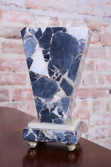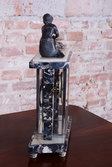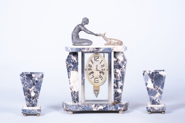 Tyto krbové hodiny jsou mistrovským dílem francouzského Art Deca 20. let 20. století. Jde o reprezentativní sadu, která ztělesňuje luxus a eleganci tehdejší francouzské společnosti. Celá sestava je vyrobena v monumentálním mramorovém provedení, které kombinuje různé odstíny kamene a vytváří tak harmonický, architektonicky laděný celek.