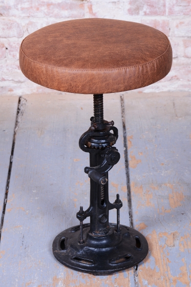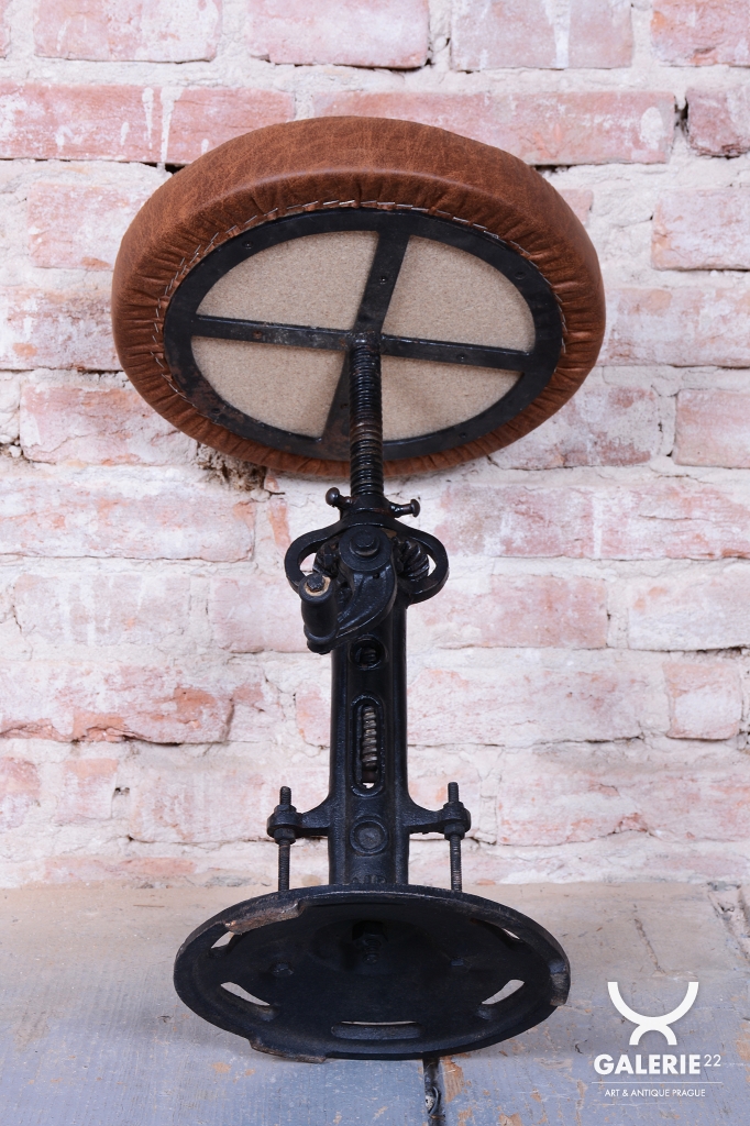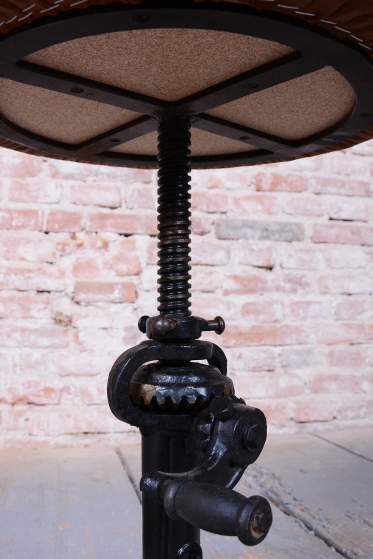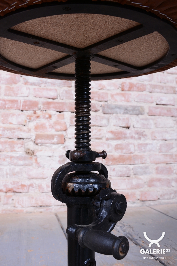 Naprostým unikátem je velmi neobvyklý mechanismus nastavování výšky, který se liší od běžně používaných systémů a svědčí o vysoké technické invenci italských mistrů. Sedák je nově čalouněn do kvalitní italské kůže, která dodává industriálnímu základu nádech luxusu a elegance. Předmět se dochoval v původním, velmi dobře zachovalém stavu, je plně funkční a díky své nastavitelné výšce nabízí široké spektrum využití od ateliéru až po moderní obývací prostor.