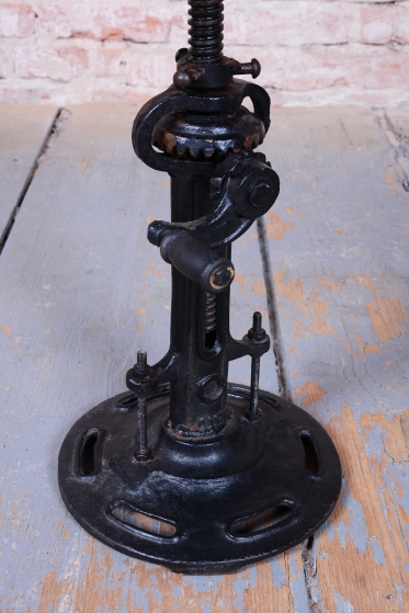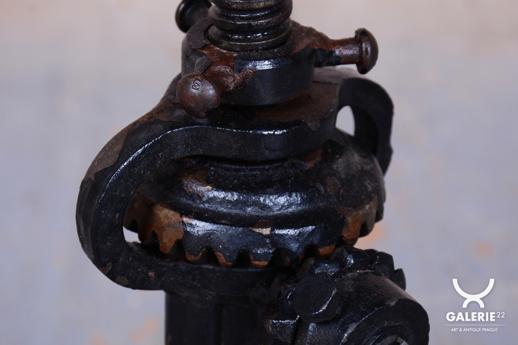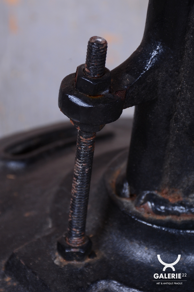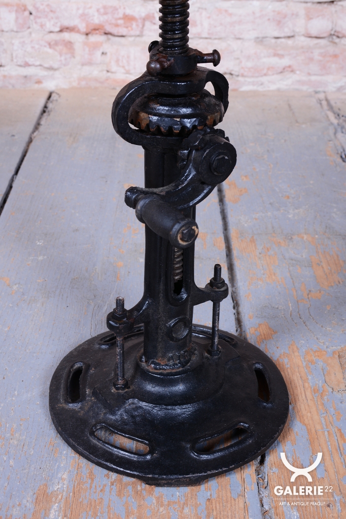 Tento italský taburet z druhé poloviny 20. století je fascinující fúzí industriálního stylu a estetiky Mid-Century. Italský design této éry je proslulý svou schopností povýšit funkční technické prvky na umělecké dílo, což tento kus dokonale potvrzuje. Základem taburetu je robustní konstrukce z kovové litiny, která zajišťuje maximální stabilitu a syrový, autentický vzhled.