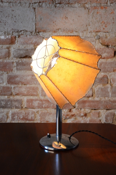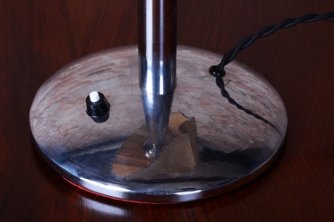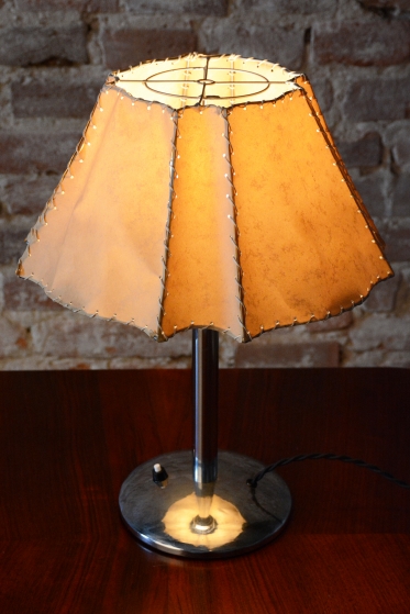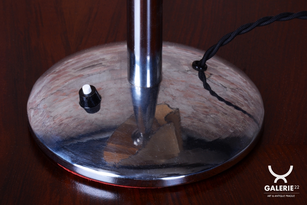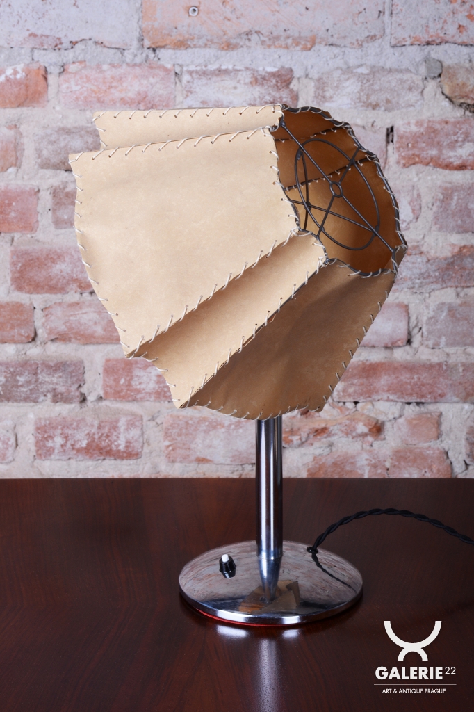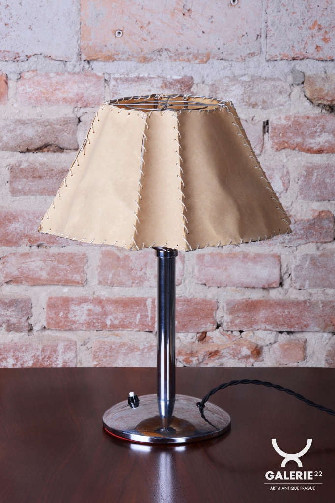 Tato stolní lampa je vynikajícím příkladem průniku stylů Art Deco a Bauhaus v Československu 30. let 20. století. Její design odráží fascinaci moderními materiály a funkční jednoduchostí, která byla pro toto období typická. Díky své subtilní formě a kontrastu zářivého kovu s měkkým světlem pergamenu se hodí jak na pracovní stůl, tak jako náladové svítidlo do moderního obývacího pokoje.