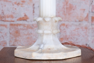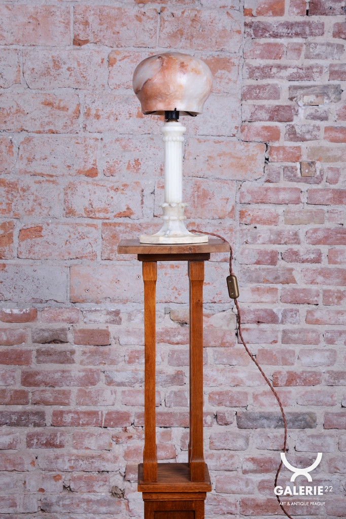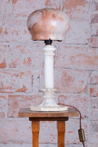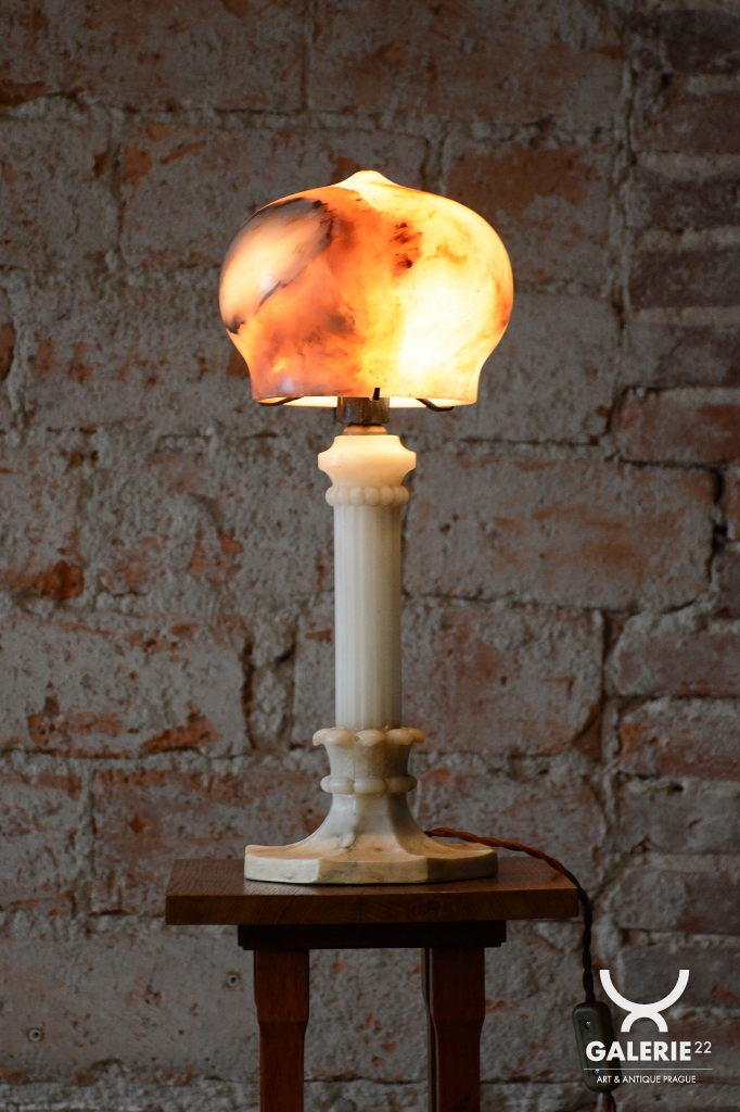 Předmět se nachází v původním, velmi zachovalém stavu. Robustní mramorová konstrukce základny poskytuje stabilitu a tvoří pevný podklad pro jemné stínidlo z alabastru. Právě alabastr je ceněn pro svou specifickou strukturu a schopnost propouštět světlo v neopakovatelných nuancích. Svítidlo prošlo technickou revizí a má novou elektrifikaci, je tedy plně funkční a připraveno k okamžitému užívání v moderním i historickém kontextu.