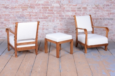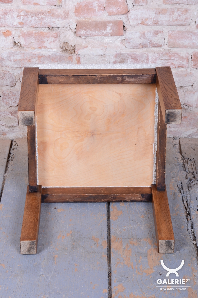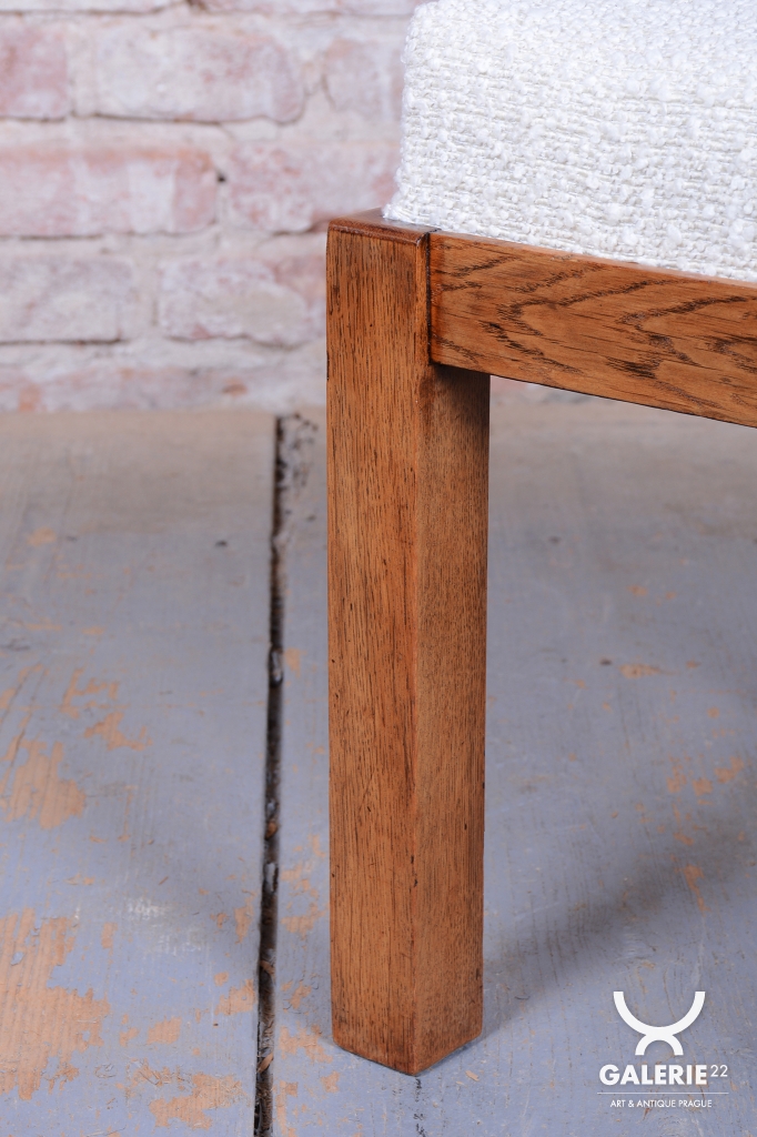 Předmět prošel kompletním restaurováním. Stabilní konstrukce z masivního dubu byla ošetřena a původní politura dřeva byla citlivě oživena, díky čemuž vynikla přirozená kresba dubového masivu. Taburet byl nově profesionálně čalouněn podle původní předlohy. Díky své pevnosti a nadčasovému vzhledu najde využití jako samostatný prvek v předsíni, ložnici nebo jako stylová podnožka k oblíbenému křeslu.