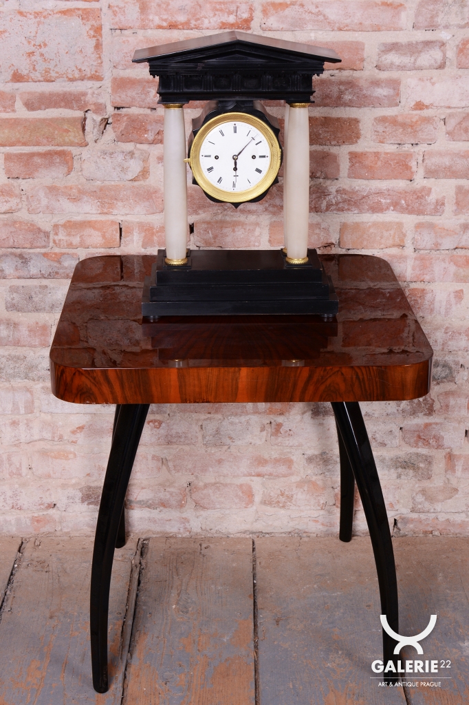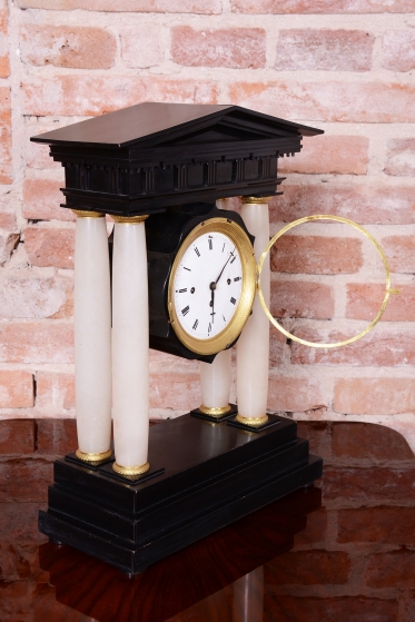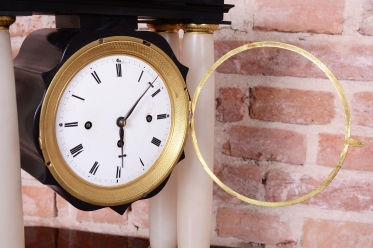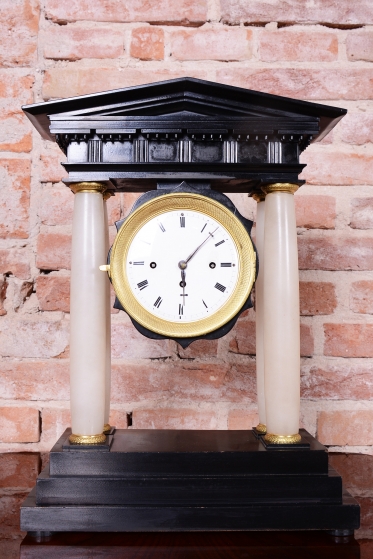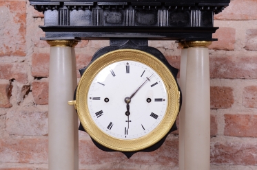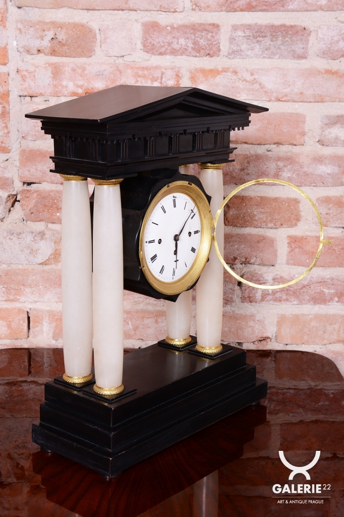 Pérové-natahují se klíčkem, chod 3-5 dní. Čtvrťové bití - 1/4 - bijí každých 15 min. Sloupy z Alabastru. Ciferník smalt. Mosazný cizelovaný věnec a patky sloupů.