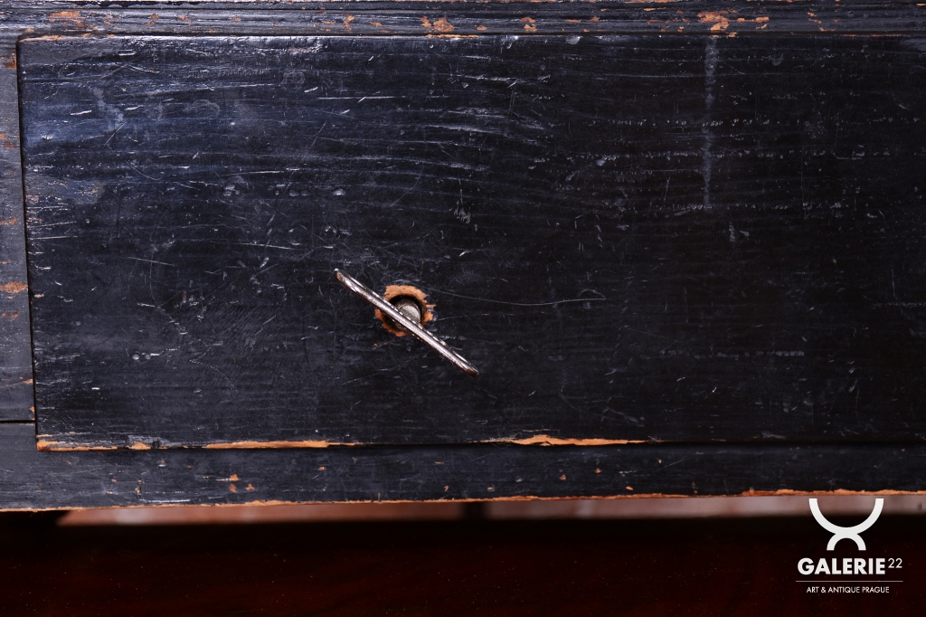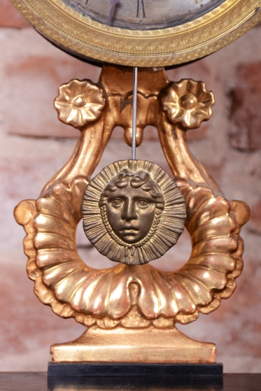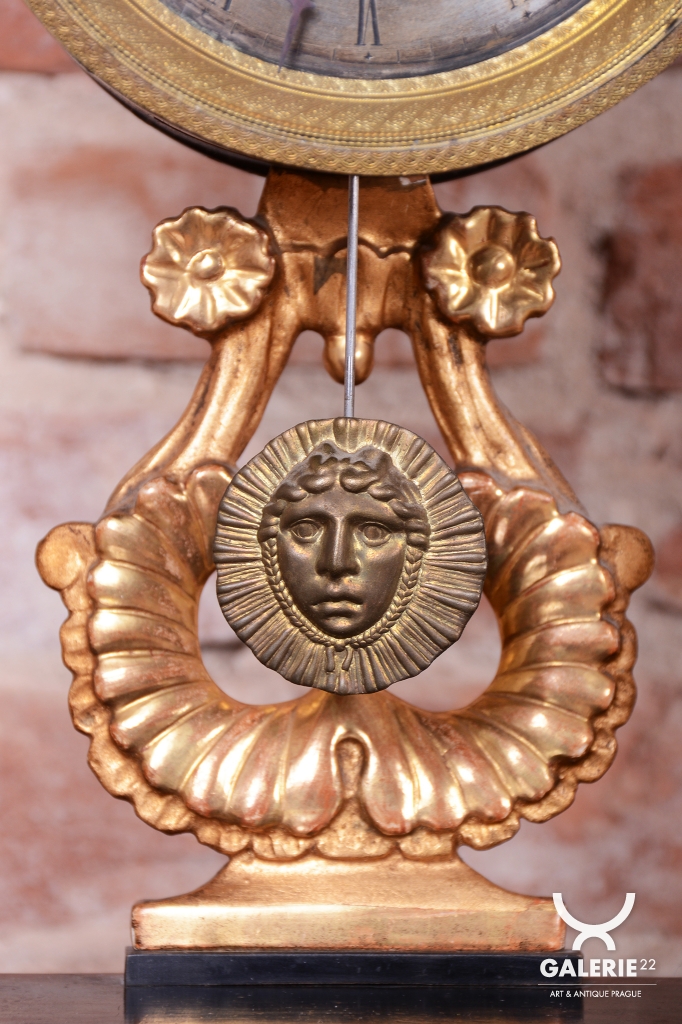 Lyra zavěšená pod ciferníkem a korintské hlavice - polychrom - zlacené plátkovým zlatem.