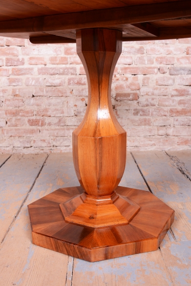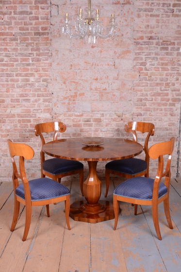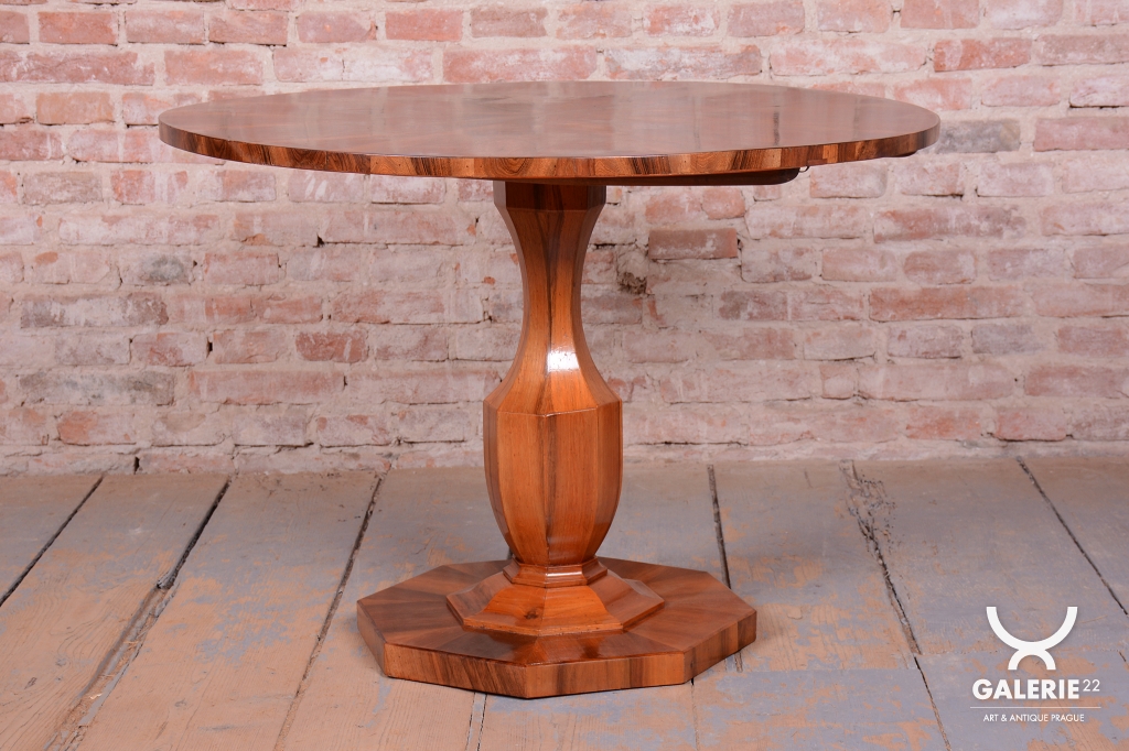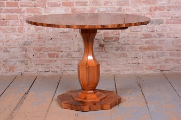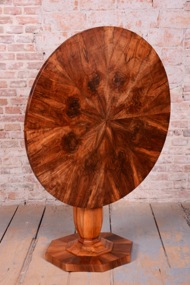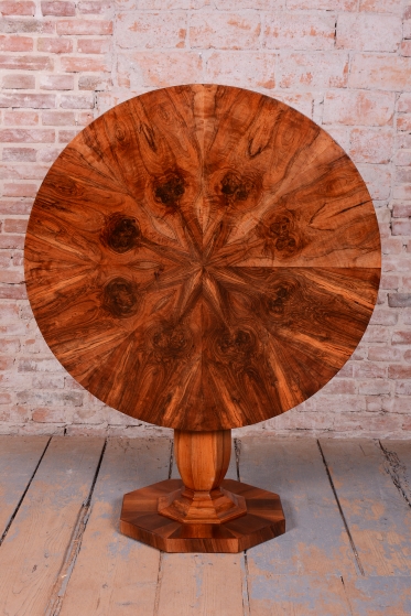 Tento výjimečný kulatý jídelní stůl představuje vrchol vídeňského biedermeieru a je připisován jednomu z nejvýznamnějších tvůrců tohoto období, architektu a designéru Josefu Danhauserovi. Stůl pochází z Rakouska ze začátku 19. století a ztělesňuje tehdejší ideál měšťanské elegance, čistých linií a funkčnosti. Hlavním materiálem je ušlechtilá ořechová dýha, jejíž kresba je na kruhové desce mistrovsky sesazena tak, aby vytvořila dekorativní obrazec.