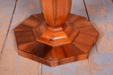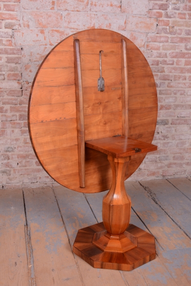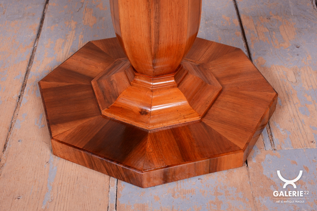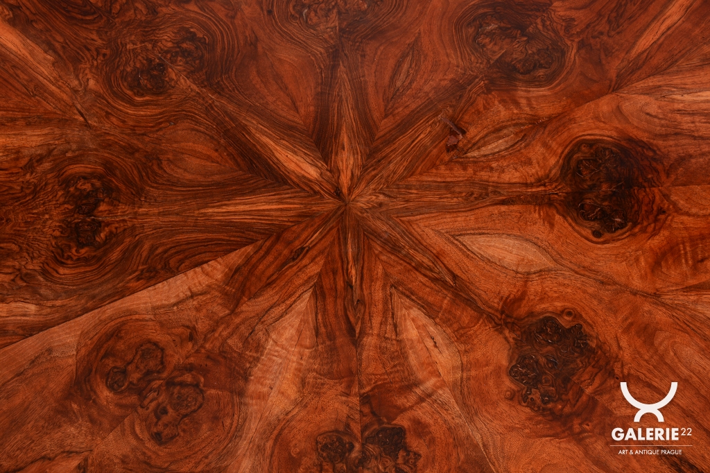 Konstrukční zajímavostí je sklopný mechanismus horní desky, který byl v době vzniku velmi oblíbený pro úsporu místa v salonu a dodnes je plně funkční. Stůl prošel odborným restaurováním, během něhož byla citlivě oživená původní politura dřeva, což dalo vyniknout hloubce a zlatavým odleskům ořechového dřeva. I přes své subtilní působení disponuje stůl stabilní a pevnou konstrukcí. Jedná se o autentický sběratelský kus, který v sobě nese rukopis vídeňské aristokratické dílny a stane se středobodem každého klasického interiéru.