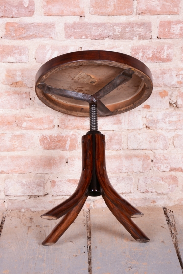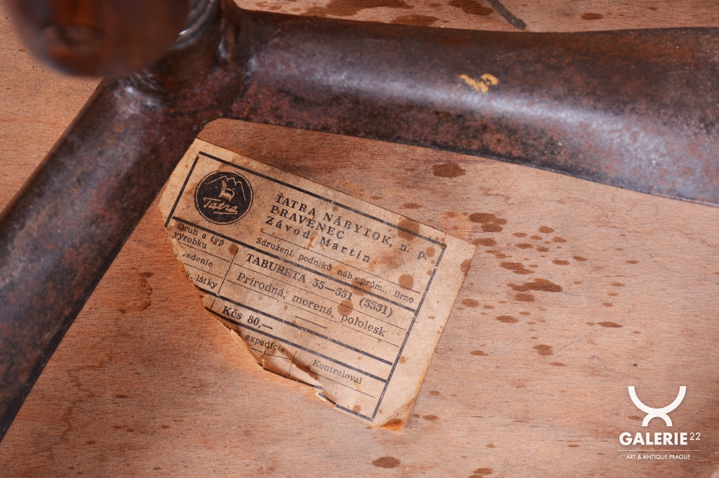 Předmět prošel odborným restaurováním, při kterém byla citlivě oživena původní politura. Konstrukce je vyrobena z bukového masivu, zatímco kruhový sedák tvoří buková překližka. Zcela zásadním prvkem je původní ocelový mechanizmus, který umožňuje plynulé nastavení výšky sedáku pouhým točením kolem své osy. Mechanika je plně funkční, stabilní a připravená k dennímu užívání.
