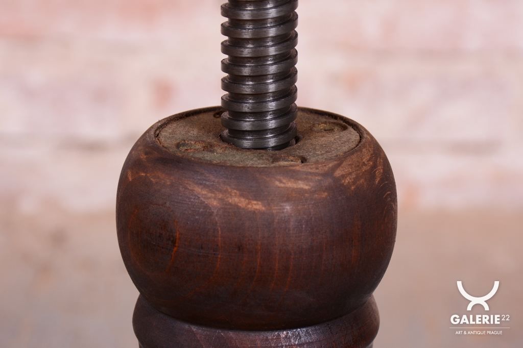Předmět prošel odborným restaurováním, při kterém byla citlivě oživena původní politura. Konstrukce je vyrobena z bukového masivu, zatímco kruhový sedák tvoří buková překližka. Zcela zásadním prvkem je původní ocelový mechanizmus, který umožňuje plynulé nastavení výšky sedáku pouhým točením kolem své osy. Mechanika je plně funkční, stabilní a připravená k dennímu užívání.