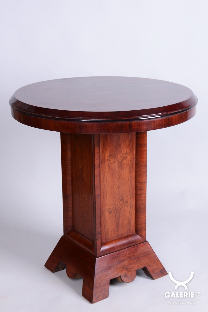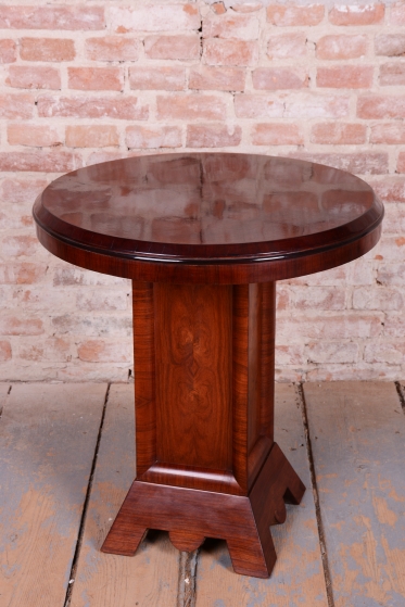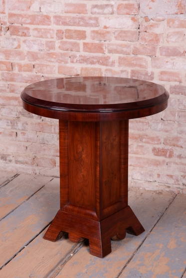 Předmět prošel odborným restaurováním. Je vyhotoven z vysoce ceněné palisandrové dýhy, která vyniká svou specifickou, hlubokou kresbou a bohatými barevnými odstíny. Původní politura dřeva byla citlivě oživena, díky čemuž povrch získal zpět svou hloubku a hedvábný lesk. Stolek je ve vynikajícím stavu, je stabilní a připraven plnit roli luxusního odkládacího či konferenčního stolku, který v sobě nese nezaměnitelný šarm francouzské meziválečné éry.