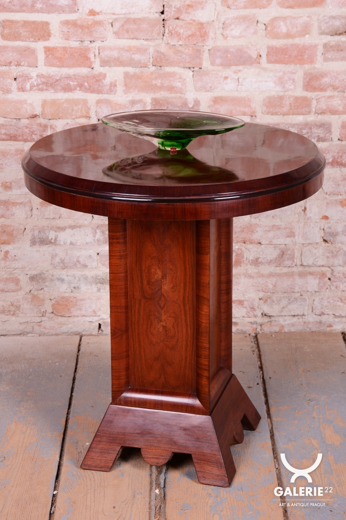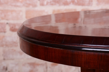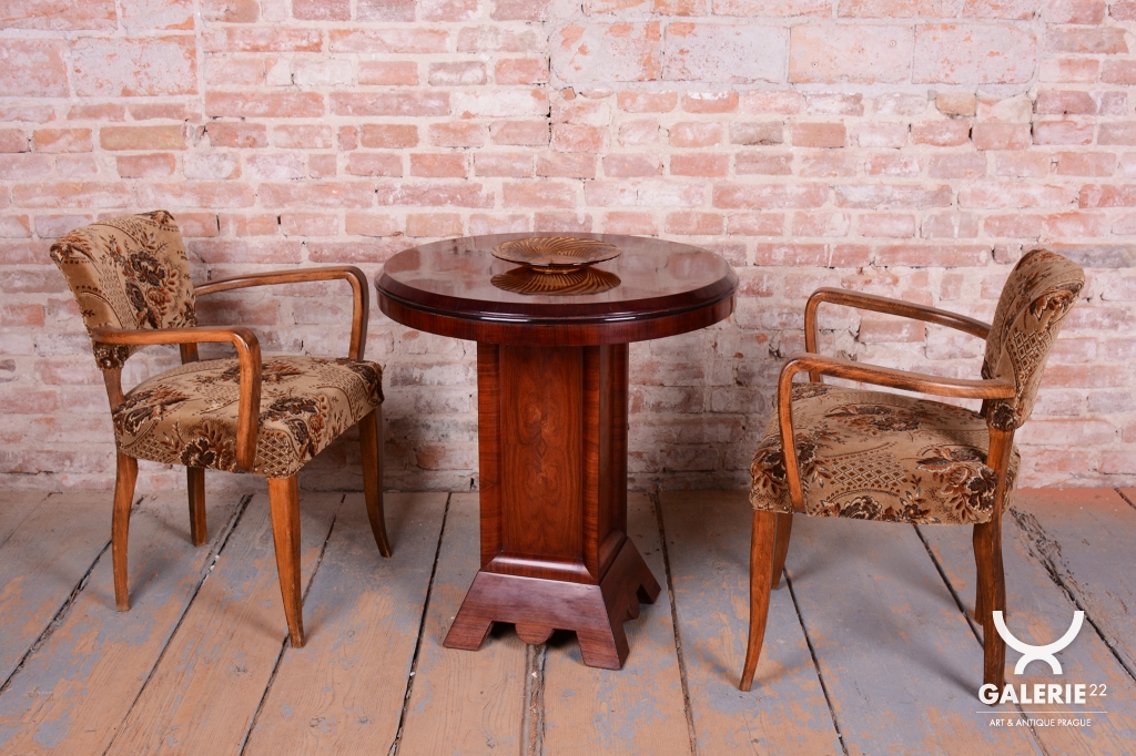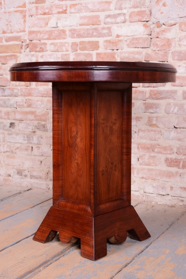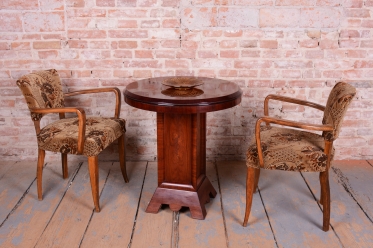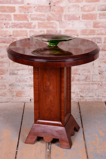 Tento kulatý stolek je mistrovským dílem francouzského Art Deca z 20. let 20. století. Francie byla v tomto období centrem luxusu a elegance a tento stolek dokonale reprezentuje tehdejší smysl pro vytříbený detail a materiálovou ušlechtilost. Geometrická čistota kruhového tvaru v kombinaci s exotickým dřevem činí z tohoto kusu nábytku nadčasový solitér, který se stane středobodem každého reprezentativního interiéru.