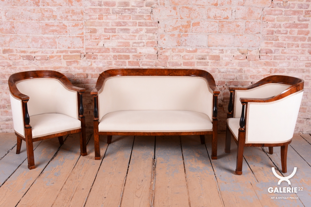 Gemini said Tato sedací souprava, sestávající z pohovky a páru křesel, je excelentní ukázkou rakouského nábytkářství období Biedermeieru z počátku 19. století. Tento styl, který se zrodil z touhy po měšťanském pohodlí a útulnosti, kladl důraz na čisté linie a přirozenou krásu dřeva. Souprava představuje dokonalou harmonii mezi reprezentativním vzhledem a intimitou domova, což z ní činí nadčasový prvek vhodný do historických i eklektických interiérů.