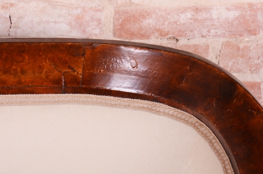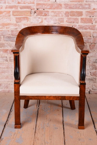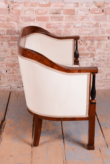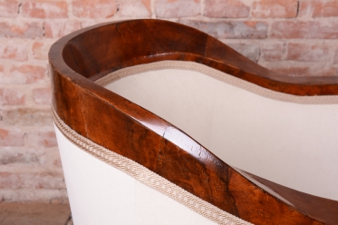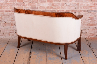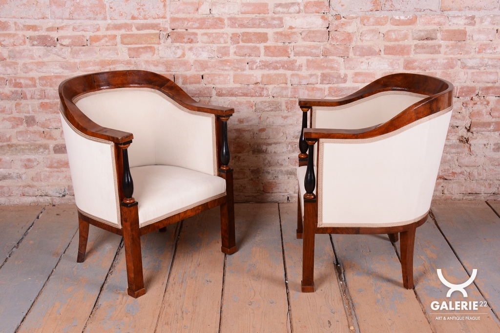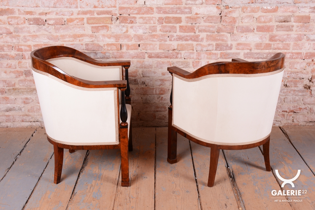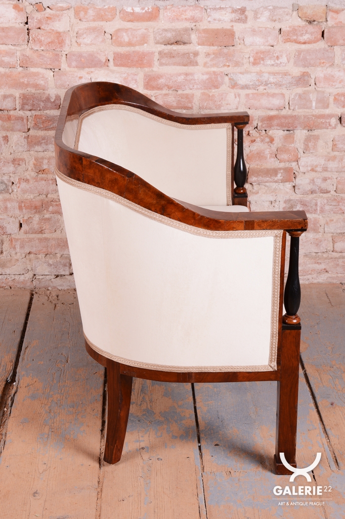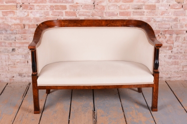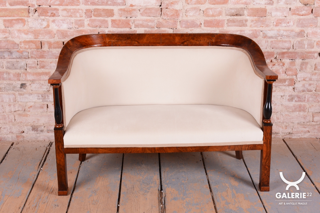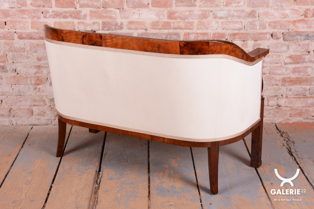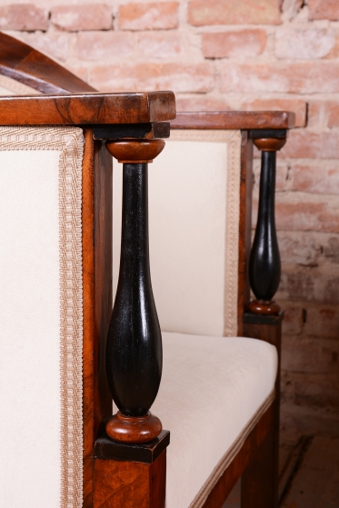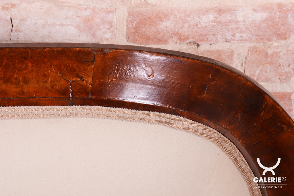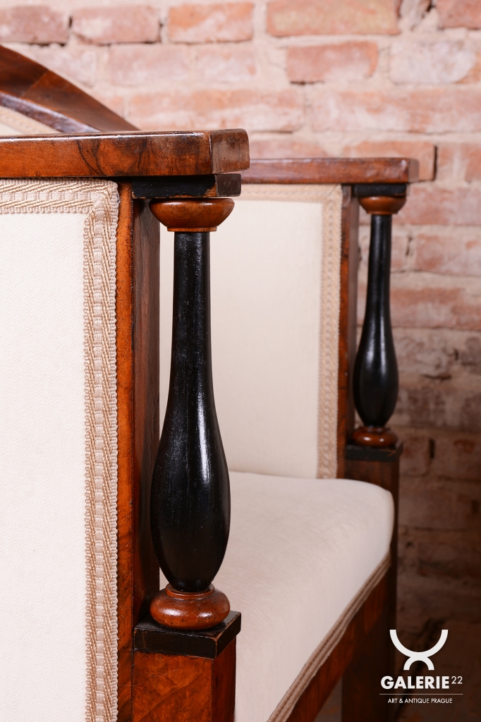 Set prošel náročným a kompletním restaurováním. Základem je robustní smrkovo-dubový masiv, který zajišťuje pevnost a stabilitu, zatímco pohledové plochy jsou dýhovány ušlechtilým ořechem. Původní politura dřeva byla citlivě oživena, díky čemuž vynikla medová barva a bohatá kresba ořechu. Unikátním dekorativním prvkem jsou subtilní ebenové sloupky, které vytvářejí elegantní kontrast k světlému dřevu. Celá souprava byla nově odborně očalouněna vysoce kvalitním textilním potahem přesně podle původní předlohy, čímž byl zachován její autentický historický charakter i maximální komfort.