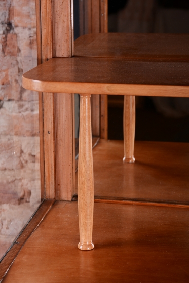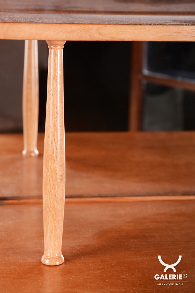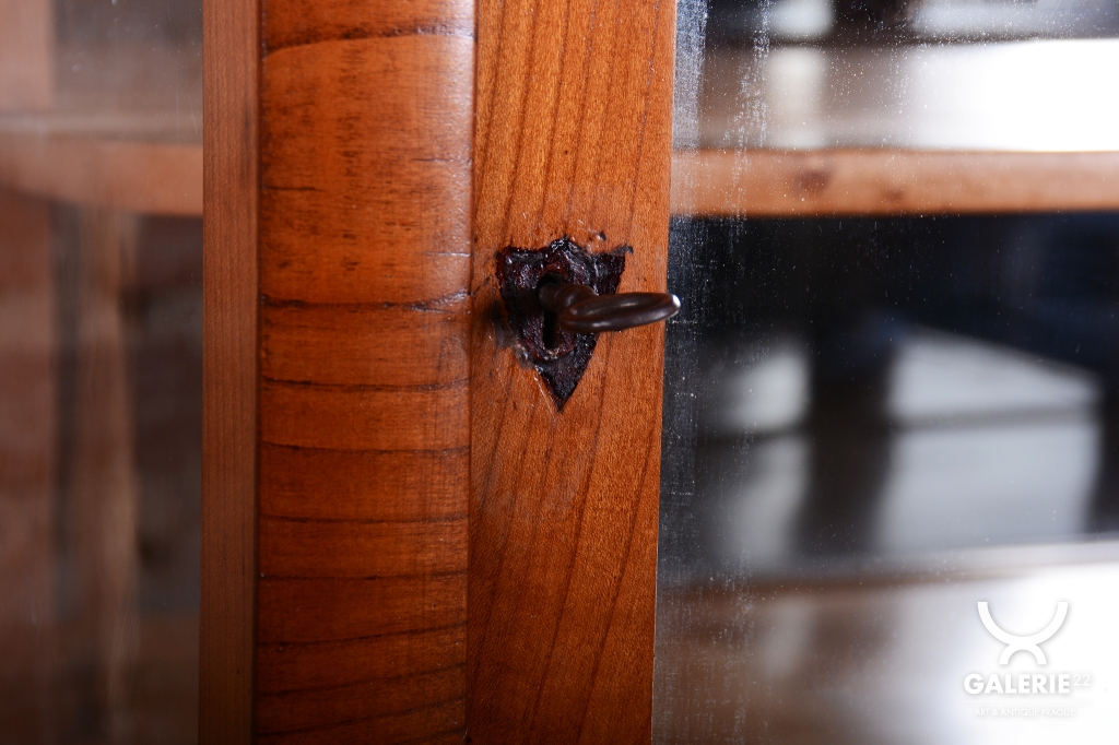 Předmět prošel odborným restaurováním, které mu navrátilo původní lesk a eleganci. Základ tvoří robustní smrkový masiv, který je z vnější strany dýhován třešní s teplým medovým odstínem, zatímco vnitřní prostor je prosvětlen javorovou dýhou. Tato kombinace vytváří efektní kontrast mezi exteriérem a interiérem vitríny. Původní politura dřeva byla citlivě oživena, čímž se zdůraznila jemná kresba třešňového dřeva. Nábytek je plně funkční a představuje reprezentativní prostor pro vystavení cenných sbírek či skla.