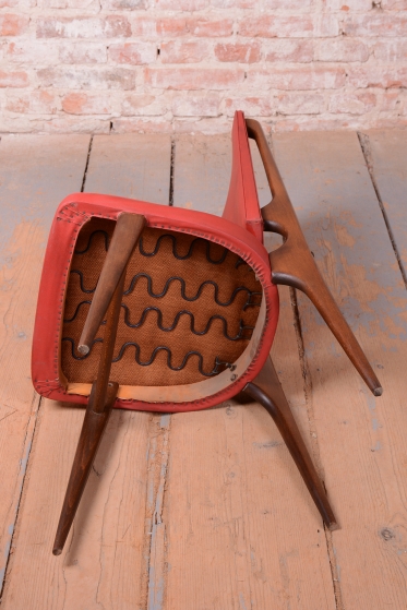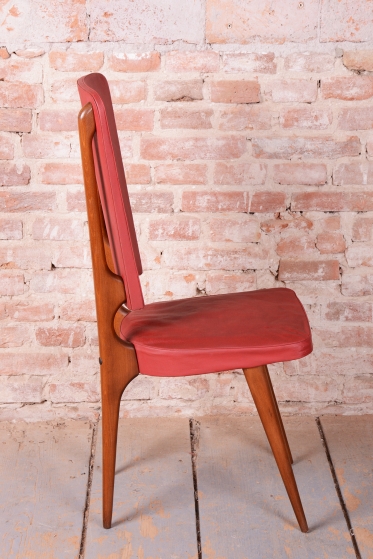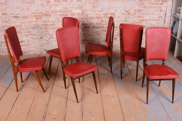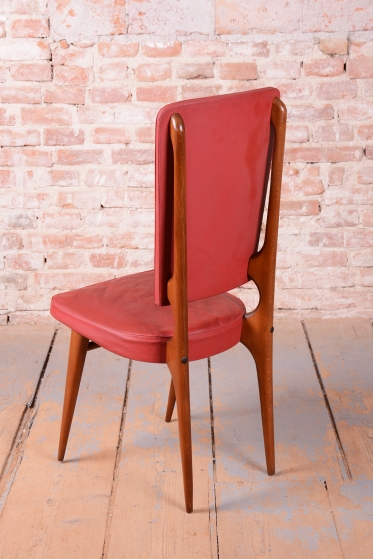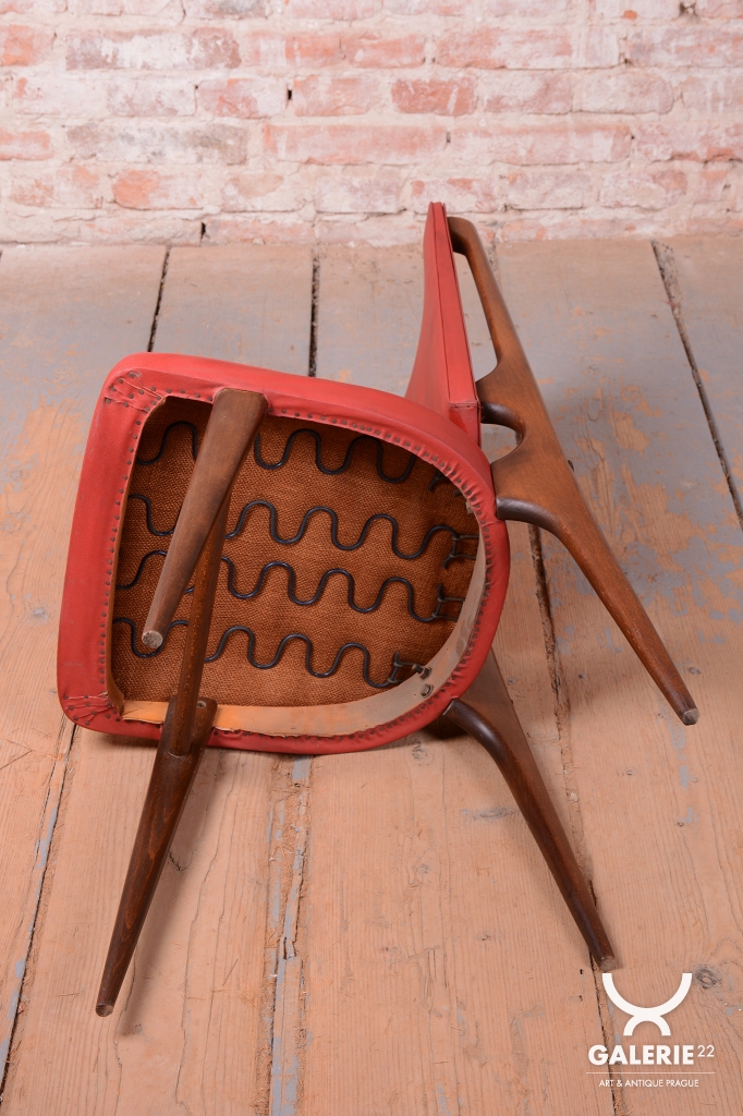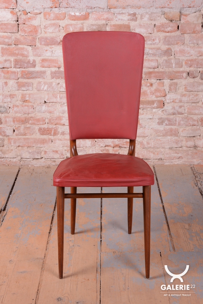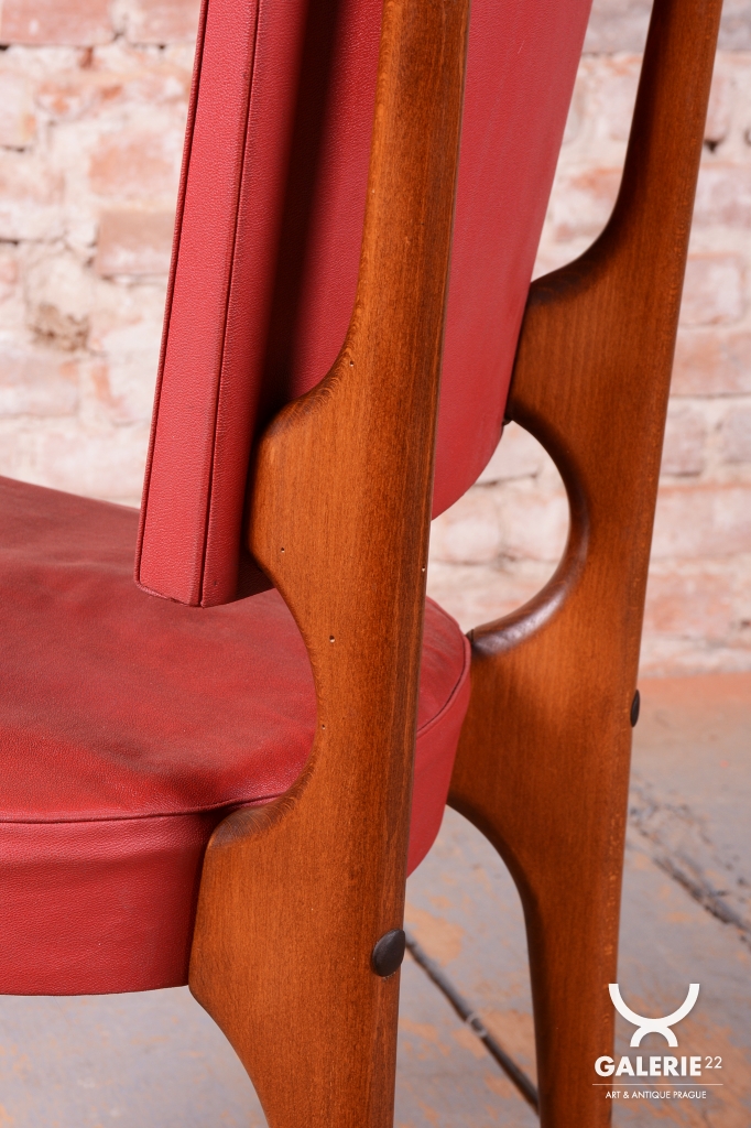 Set se nachází v původním, velmi zachovalém stavu, což z něj činí unikátní sběratelskou příležitost. Stabilní konstrukce z bukového masivu nese typické znaky Leleuovy tvorby – elegantní prohnutí nohou a subtilní, přesto pevnou siluetu. Sedáky a opěrky jsou potaženy původní koženkou, která díky dobré údržbě zůstala autentickým svědkem doby. Tato sada představuje dokonalou investici pro milovníky nadčasového designu, který v sobě pojí klasickou řemeslnou poctivost s moderní lehkostí.