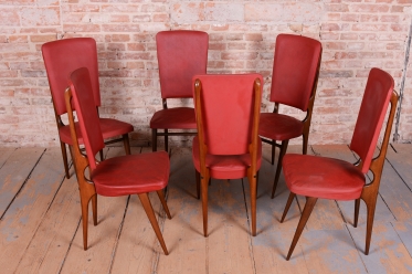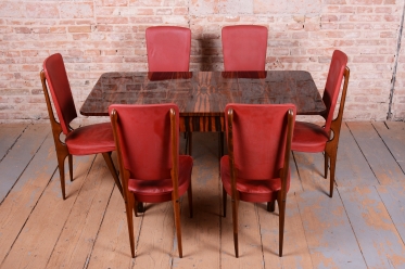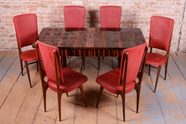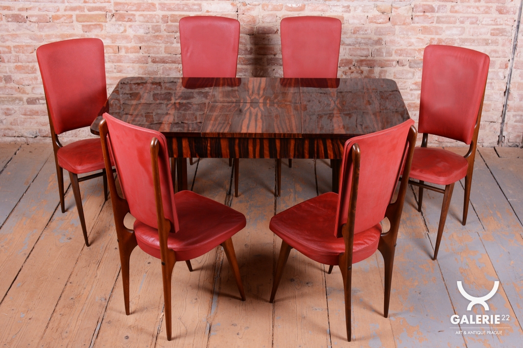 Tato sada šesti židlí je špičkovou ukázkou pozdního francouzského Art Deca 40. let 20. století. Autorem návrhu je jeden z nejuznávanějších dekoratérů a architektů své doby, Jules Leleu, jehož jméno je synonymem pro luxusní a rafinovaný francouzský styl. Židle byly vyrobeny renomovanou společností Stella, která byla známá svou precizností a schopností realizovat náročné návrhy předních designérů.