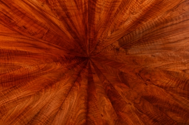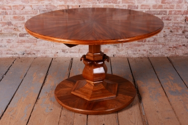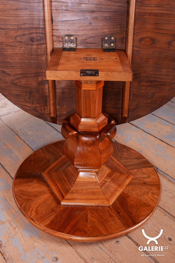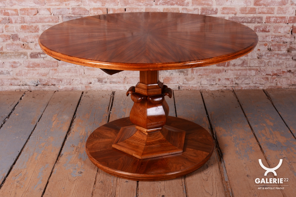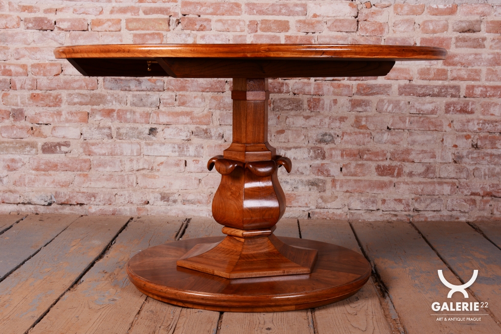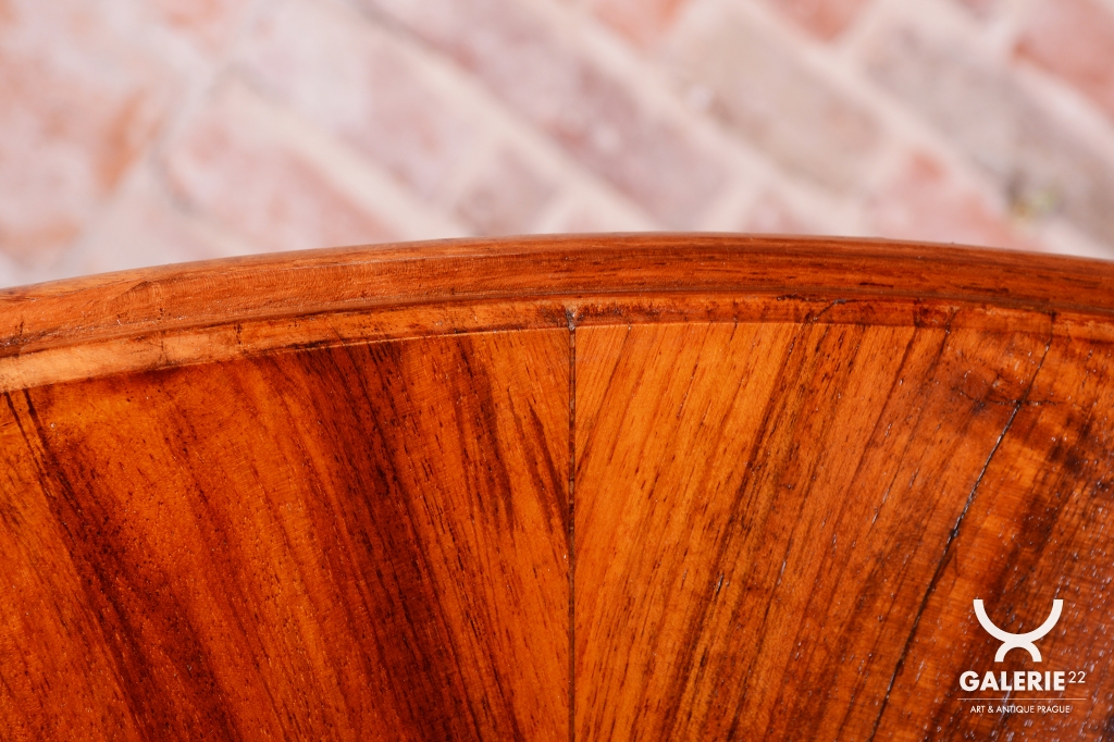 Stůl prošel precizním restaurováním, při kterém byla citlivě oživena původní politura dřeva. Dominantním prvkem je ořechová dýha s naprosto mistrnou skladbou, kde kresba dřeva vytváří fascinující symetrické obrazce. Tento detail svědčí o mimořádné zručnosti tehdejších mistrů dýhařů, kteří dokázali přirozenou strukturu dřeva povýšit na umělecké dílo. Robustní, a přesto elegantní podnož zajišťuje stabilitu a podtrhuje architektonickou čistotu celého kusu.