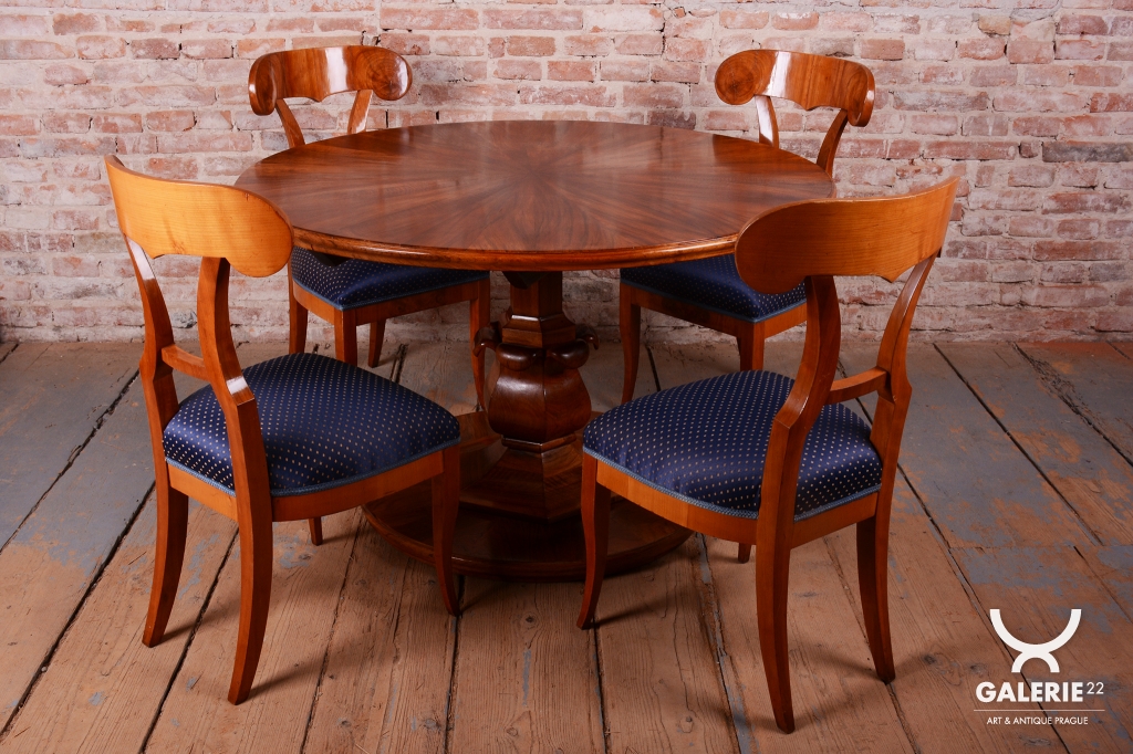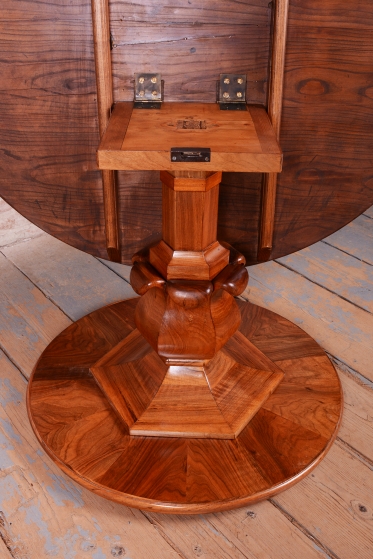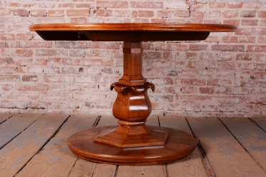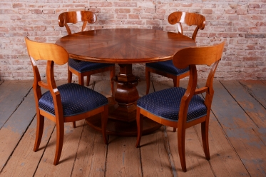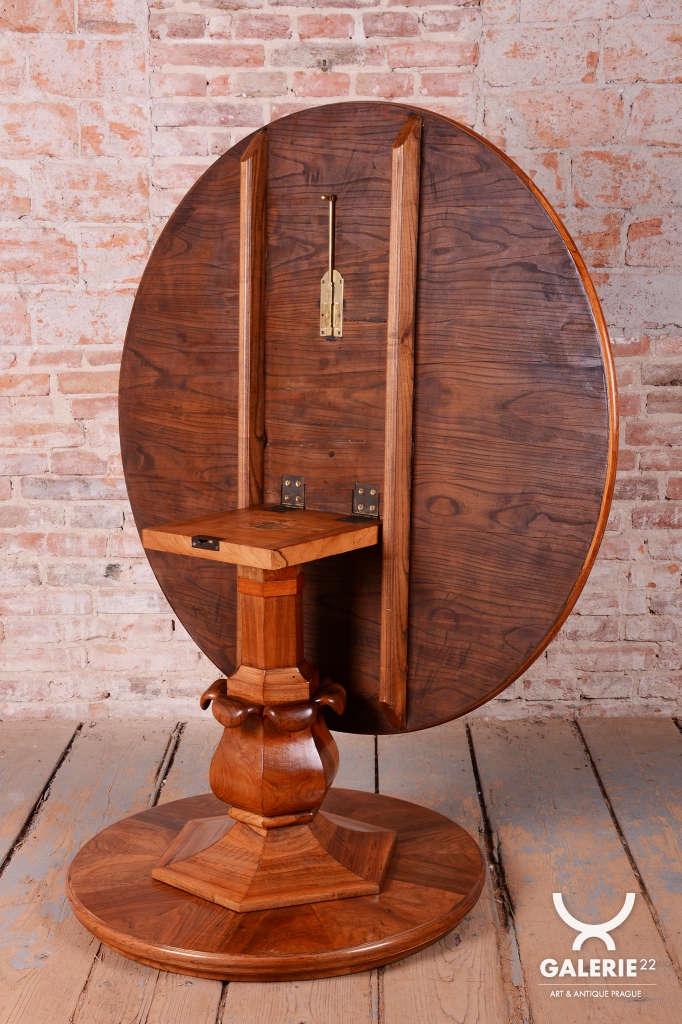 Tento jídelní stůl se sklopnou vrchní deskou je brilantní ukázkou rakouského nábytkářství z období Biedermeieru počátku 19. století. Jde o kus, který v sobě spojuje praktickou vynalézavost s estetickou vytříbeností – mechanismus sklopné desky umožňoval flexibilní využití prostoru v měšťanských salonech, zatímco jeho provedení reprezentuje vrcholné řemeslné umění své doby.