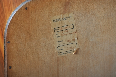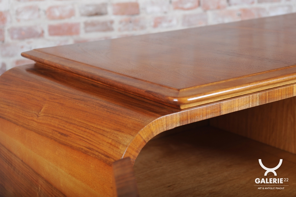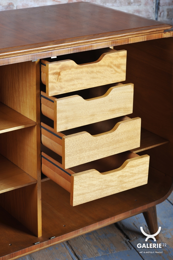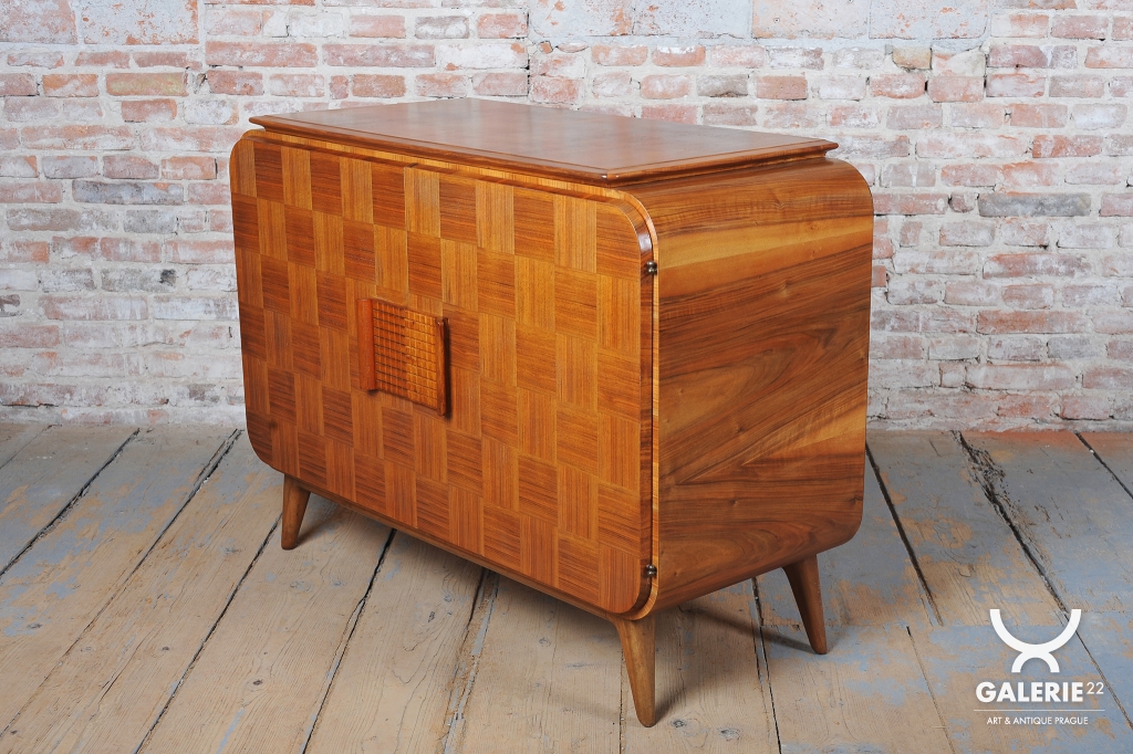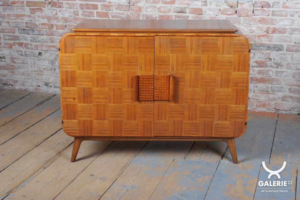 Bufet prošel precizním restaurováním, které podtrhlo jeho výjimečné materiálové zpracování. Konstrukce z laťovky je dýhována vzácným mahagonem, přičemž nejvýraznějším prvkem je šachovnicově skládaná dýha na čelních dvířkách, doplněná o masivní, výrazné madlo. Boky skříňky pak nechávají plně vyniknout přirozené, hluboké kresbě mahagonového dřeva. Vnitřní prostor je velmi prakticky členěn na soustavu zásuvek a čtyř šuplíků, což z něj činí vysoce funkční úložný prvek.